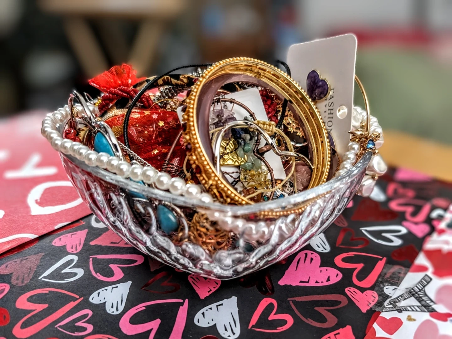 Selling a collection of assorted jewelry filled in a decorative glass jar. Includes necklaces, bracelets, rings, and earrings with various charms like hearts and stars. A fun assortment for accessorizing!