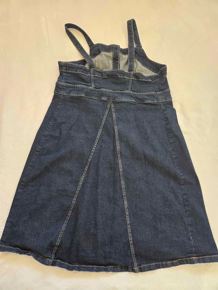 Denim dress with straps and button front. Nice topstitching with contrasting thread.