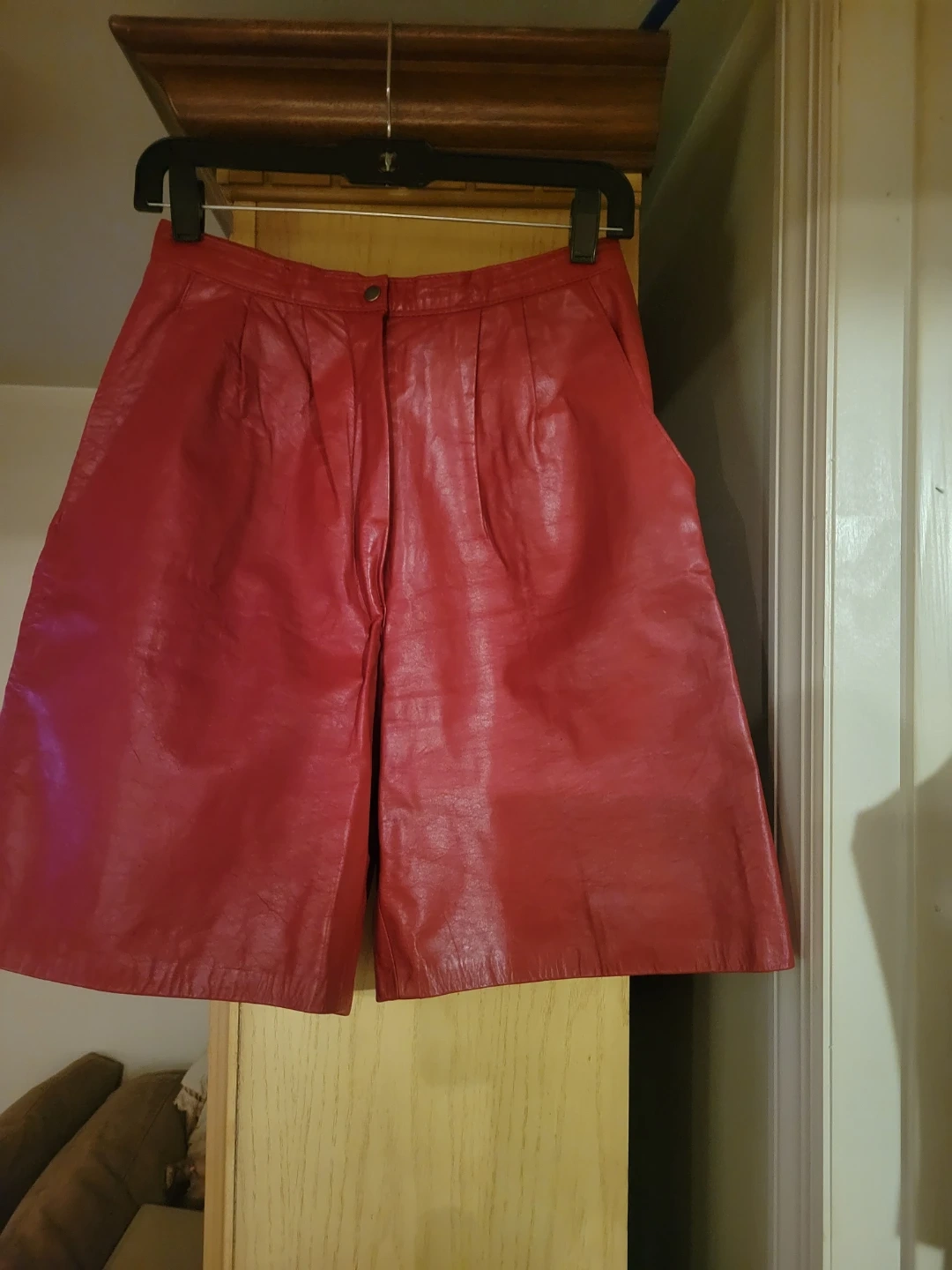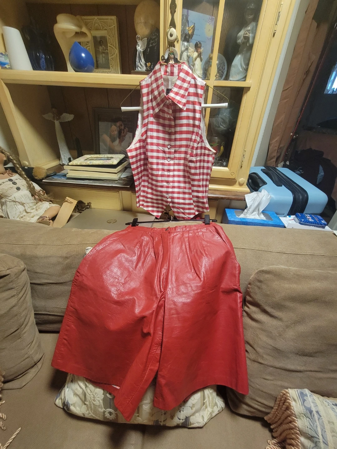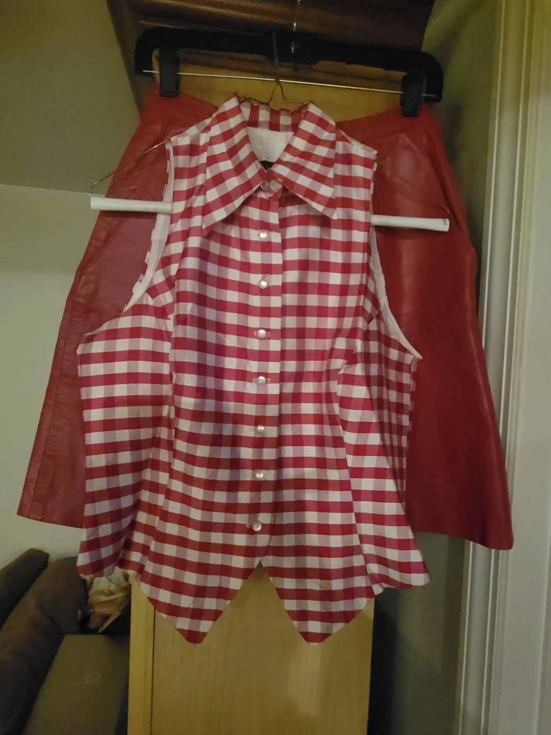 Red leather shorts and a red and white gingham print sleeveless button-up vest. These pieces can be worn together or separately for a unique look!