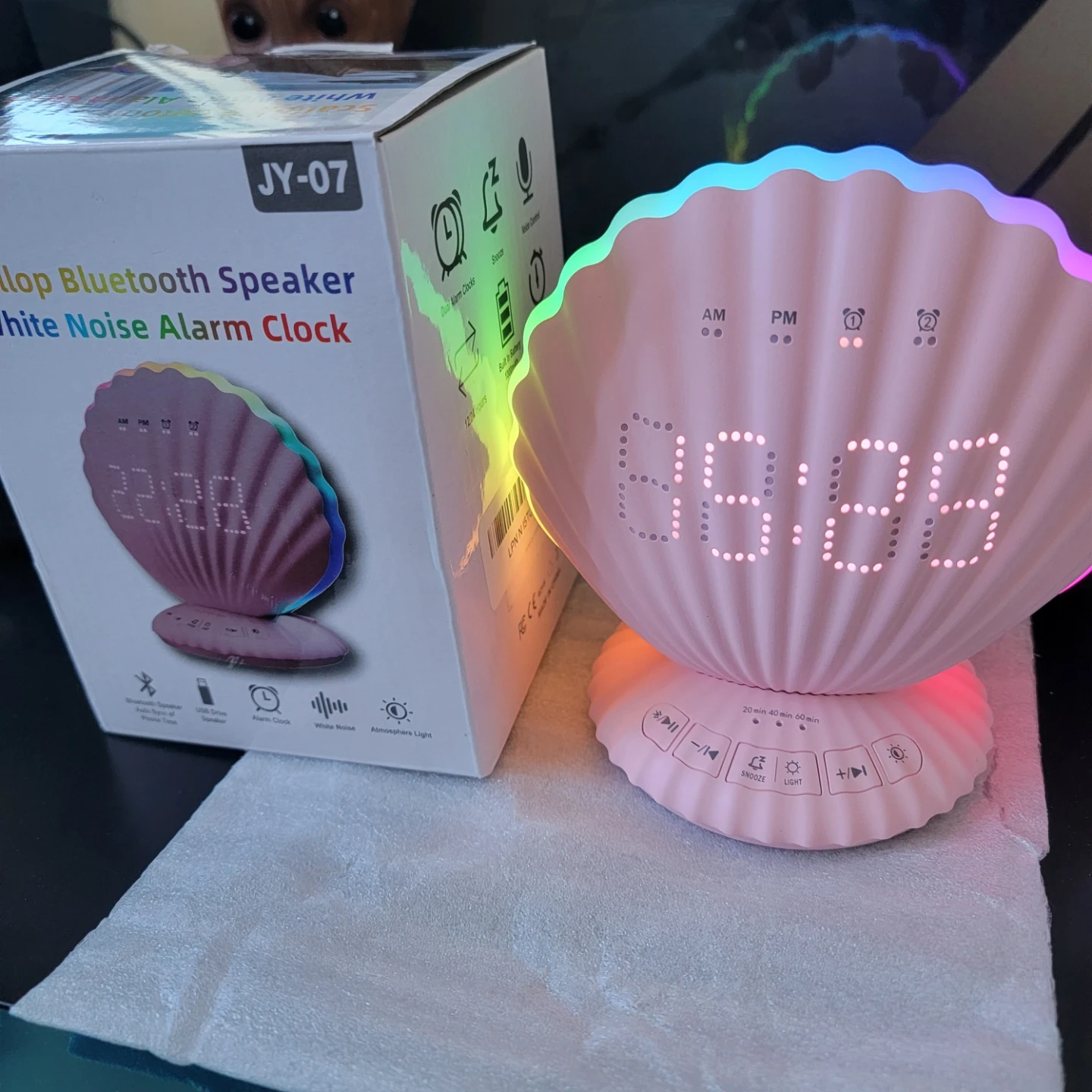 This pink seashell alarm clock also functions as a Bluetooth speaker and offers white noise and atmospheric lighting. It includes a snooze function and timer settings. The LED display shows the time clearly.