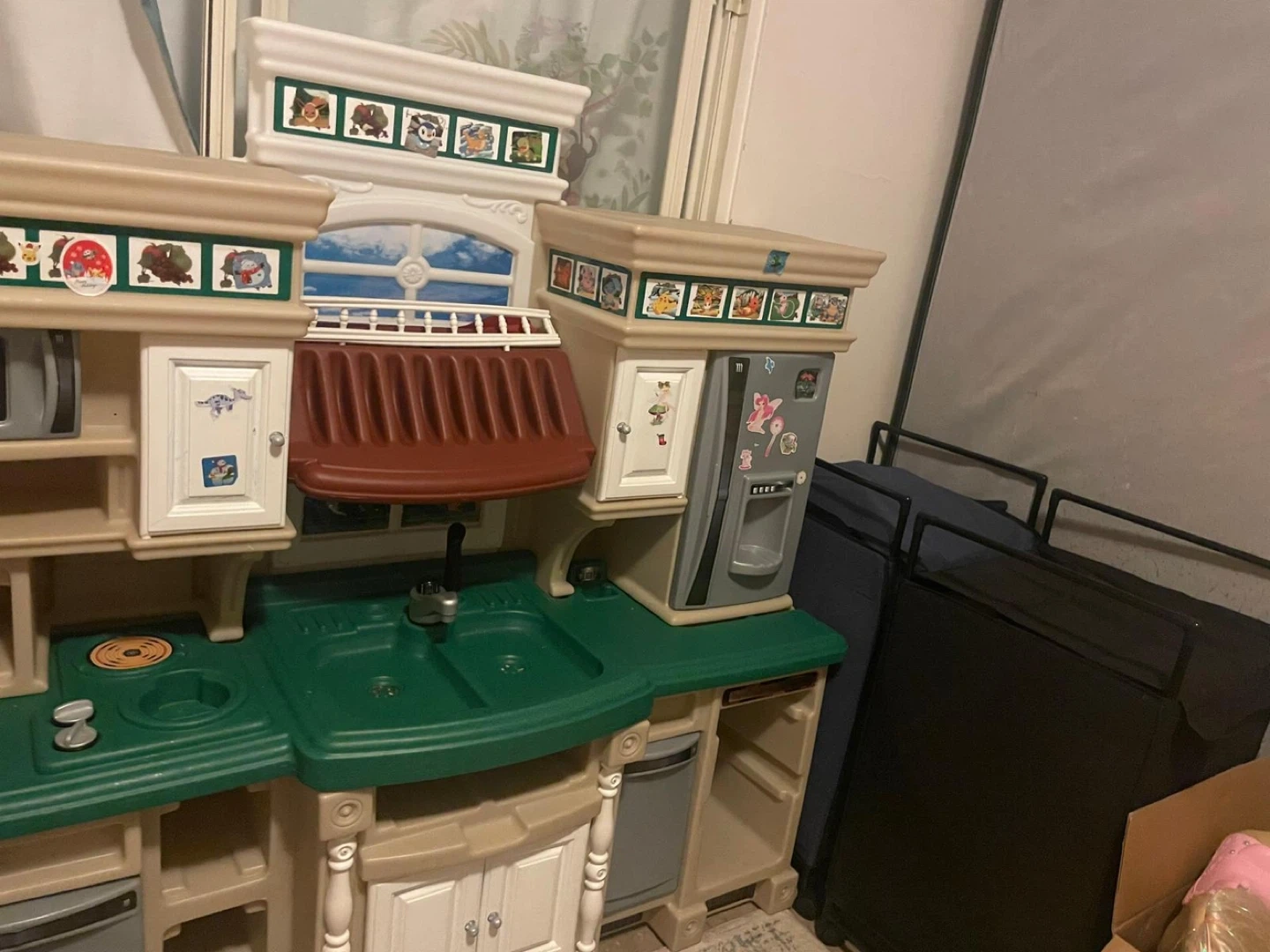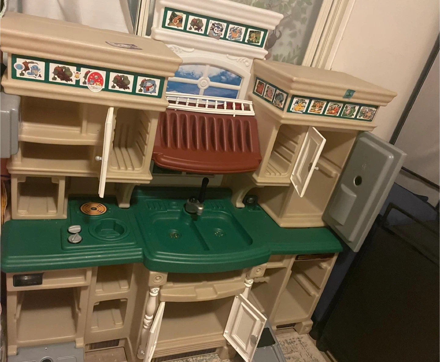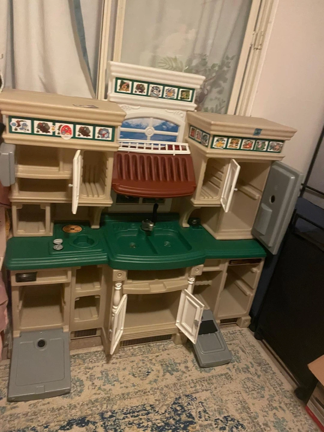 This is a Step2 play kitchen. It features a sink with a faucet, a stovetop, and an oven. There are cabinets for storage and a refrigerator. It's great for imaginative play!