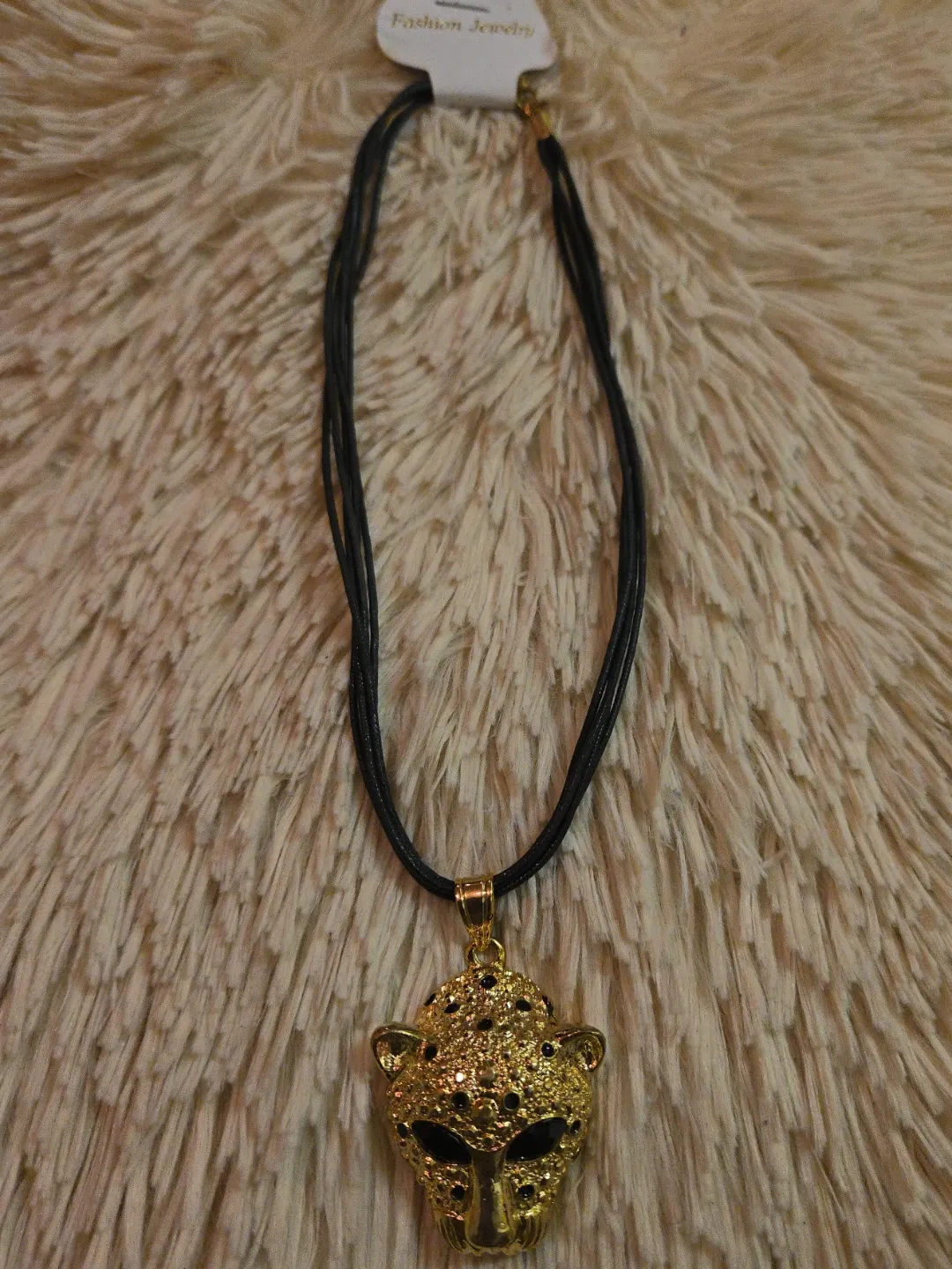 Selling a gold-tone leopard pendant necklace. The pendant features black accents and a black cord. It's a unique piece to add to your collection!