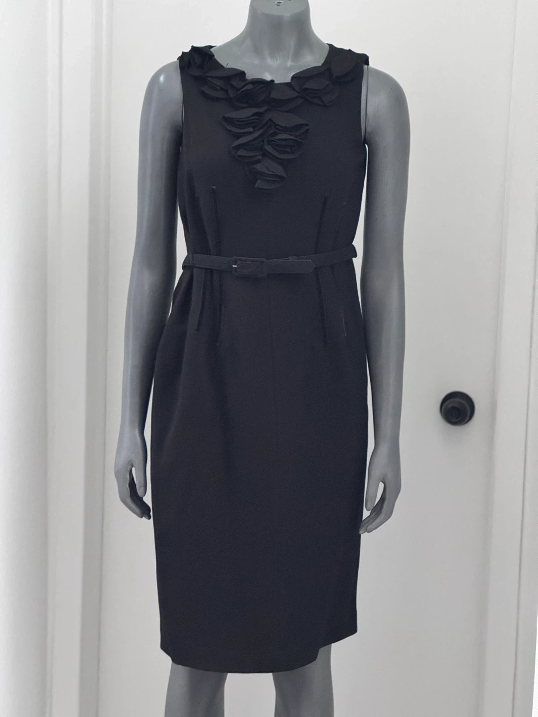 Anne Klein sleeveless black dress featuring a decorative ruffle accent around the neckline and a matching belt at the waist. It has a velvet strips at waist and a concealed back zipper closure. The skirt includes a back vent for ease of movement. NWT