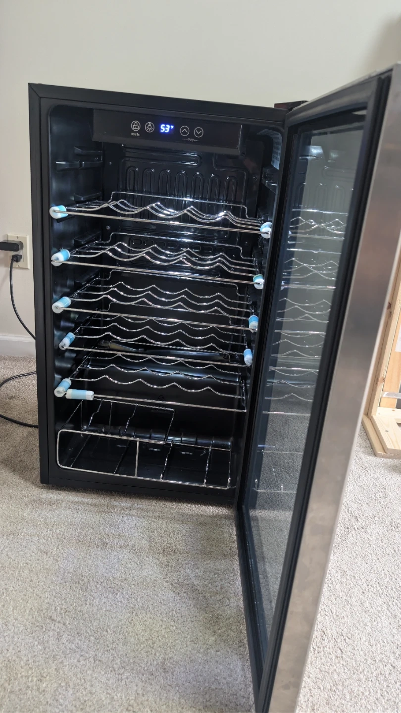 Insignia wine cooler - lightly used, perfect condition. It's a 29-bottle capacity model with a stainless steel finish. The unit has multiple racks for organizing your bottles.