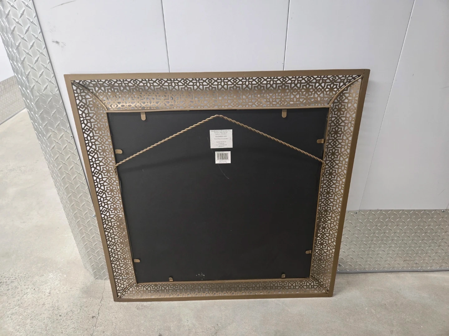 Beautiful decorative mirror with a gold metal frame featuring an intricate geometric pattern. It's perfect for adding a stylish touch to any room. The frame's design is eye-catching and adds a touch of elegance to your home decor. A great accent piece for your living room, bedroom, or hallway!
