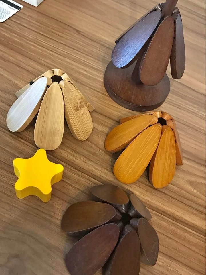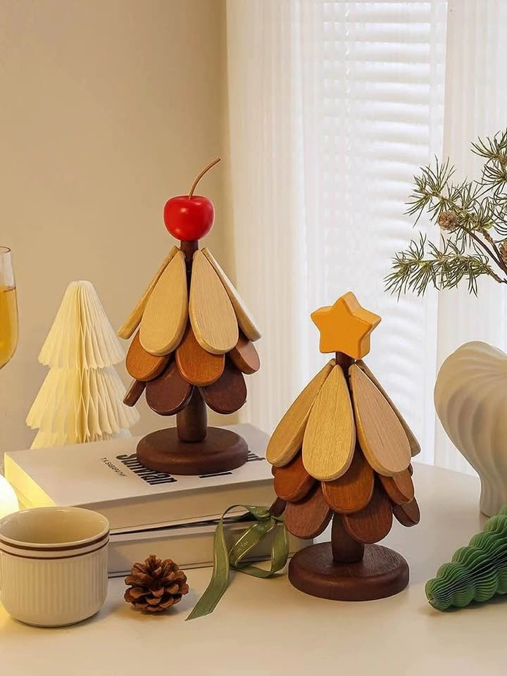 The design of these coasters, made from bamboo and wood, a tidy storage solution, resembling a mini Christmas tree.