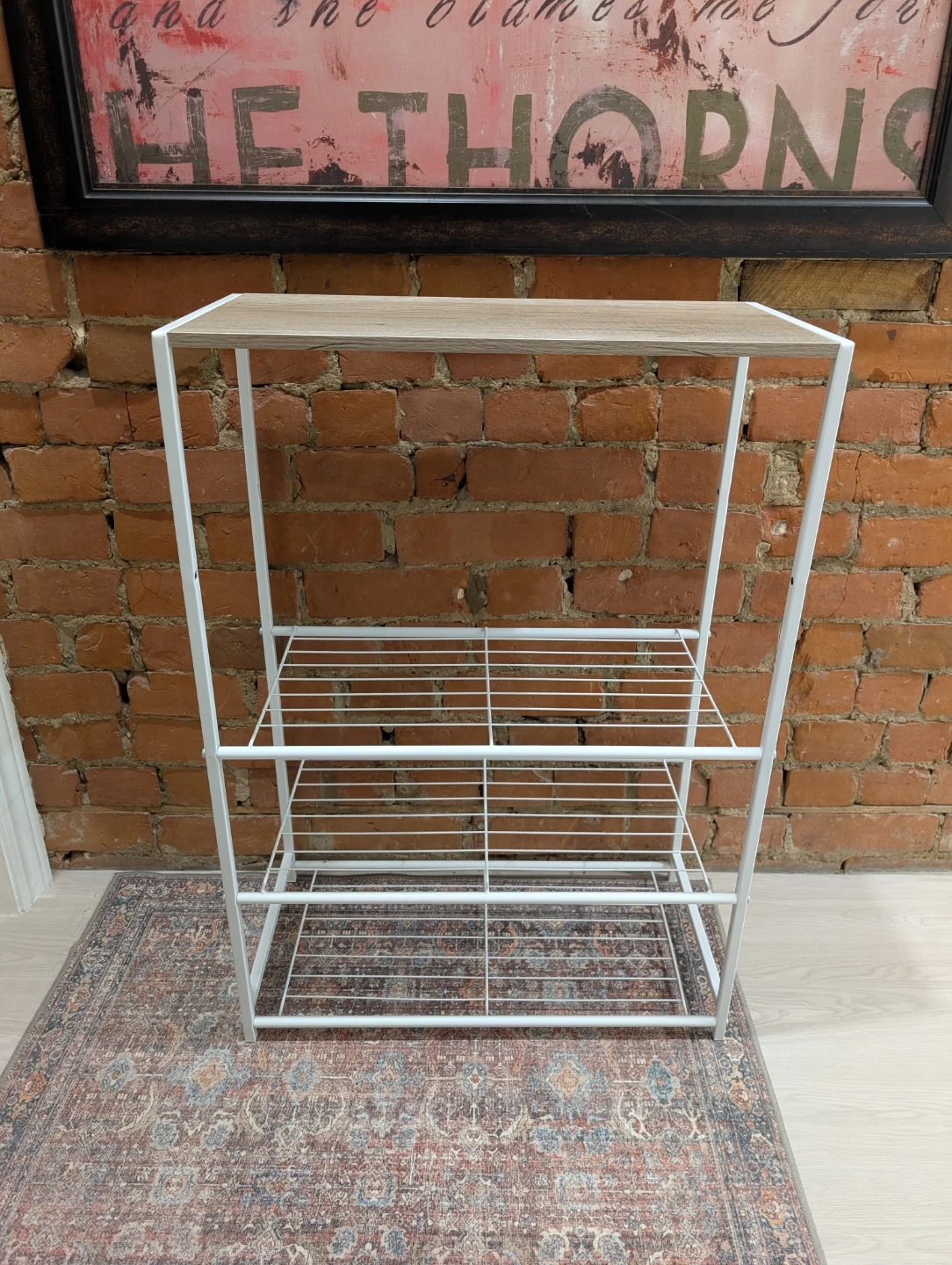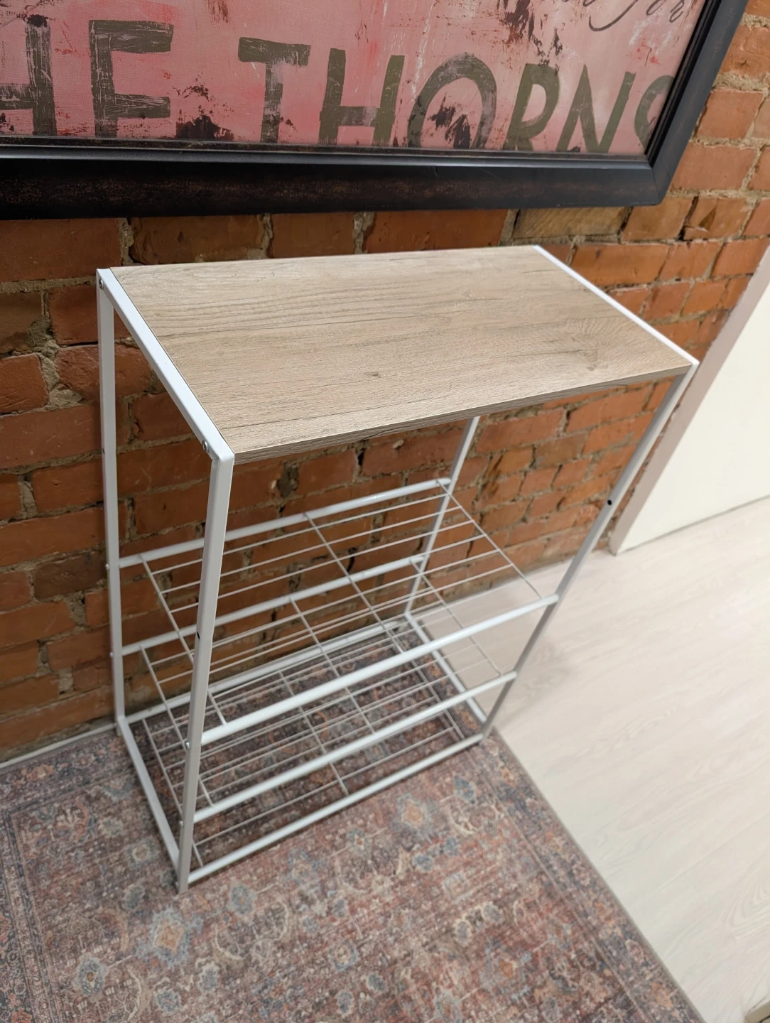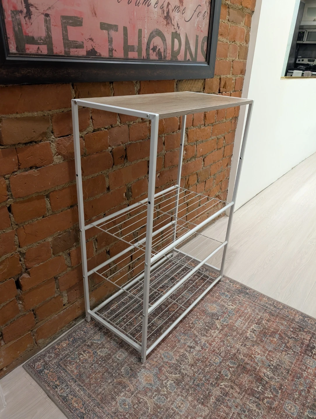 This is a three-tier shelf with a light wood laminate top shelf. It's made of white metal tubing and wire shelves.