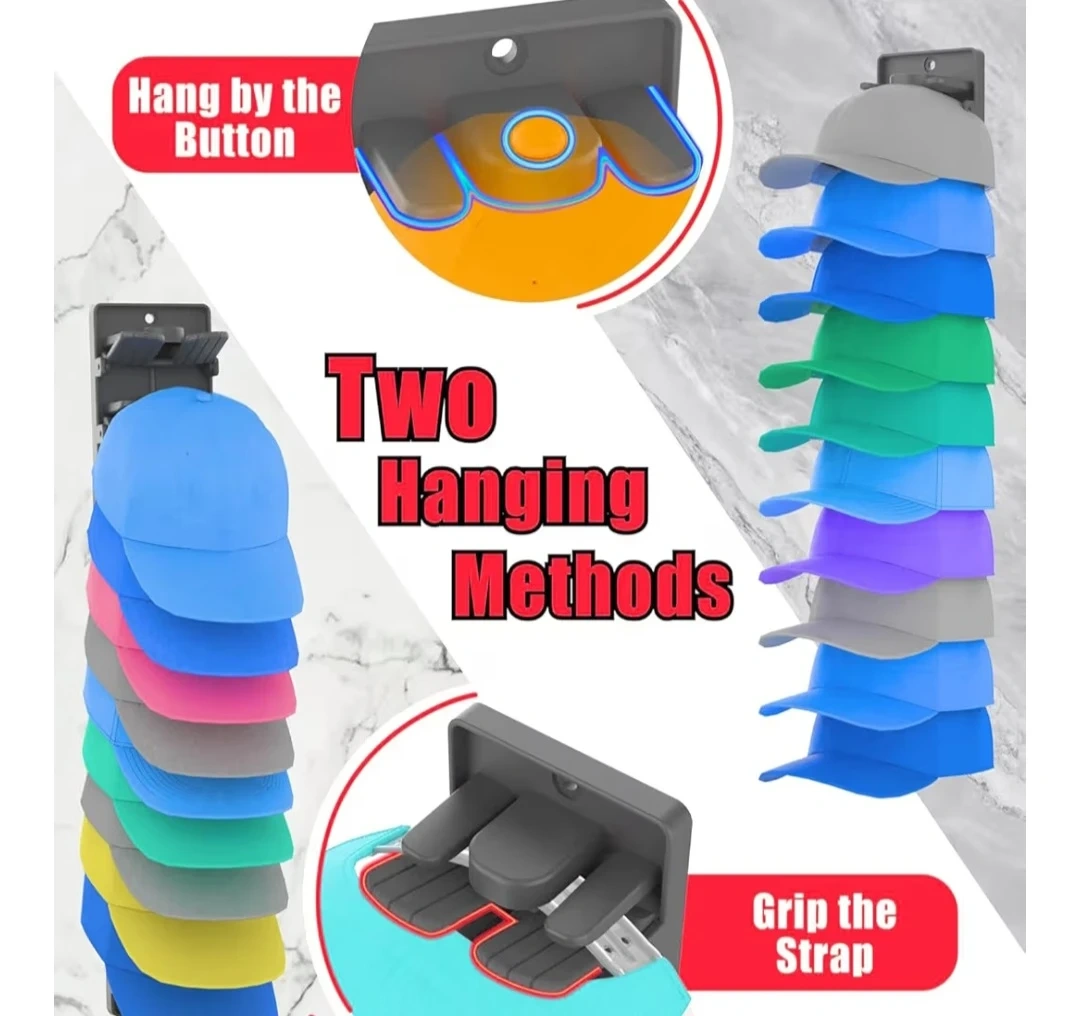 Hat Organizer for Baseball Caps, Wall Mounted Hat Rack with Strong Adhesive, 2 Pack Hat Storage Display Holder, Multilayer Hat Hooks for Door, Bedroom, Closet & Garage, Space Saving Hat Hanger (Black)