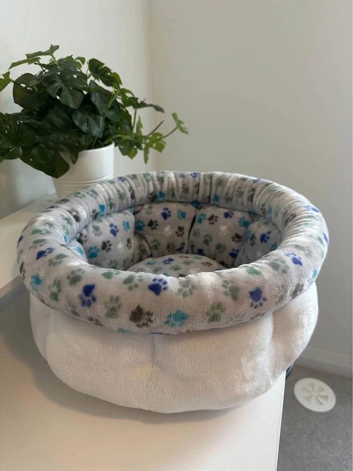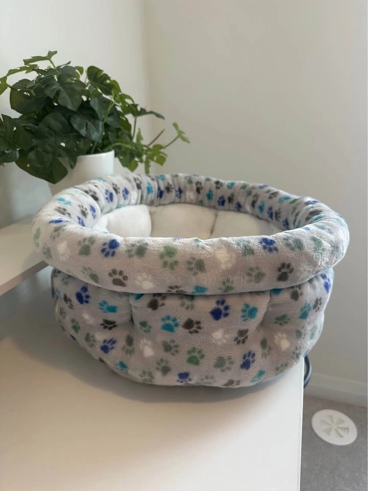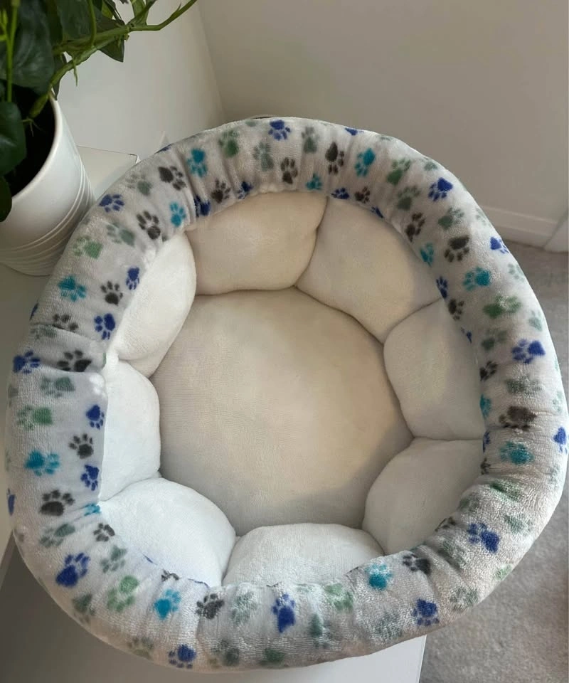 Owned for about a year, but never used. Bought for our kitten and he didn't like it. It's in just about perfect condition. Dimensions: height- 8.5", width & length- 16x16".