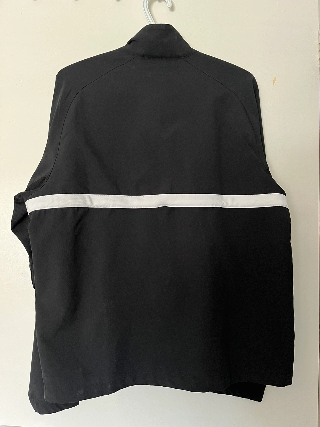 Previously worn in good condition. Made of Nike FIT DRY material. Loose/baggy fitting warm up jacket and matching pants. Color is black with white striping. Size medium but can fit large. Meant to be worn overtop tshirt and shorts.