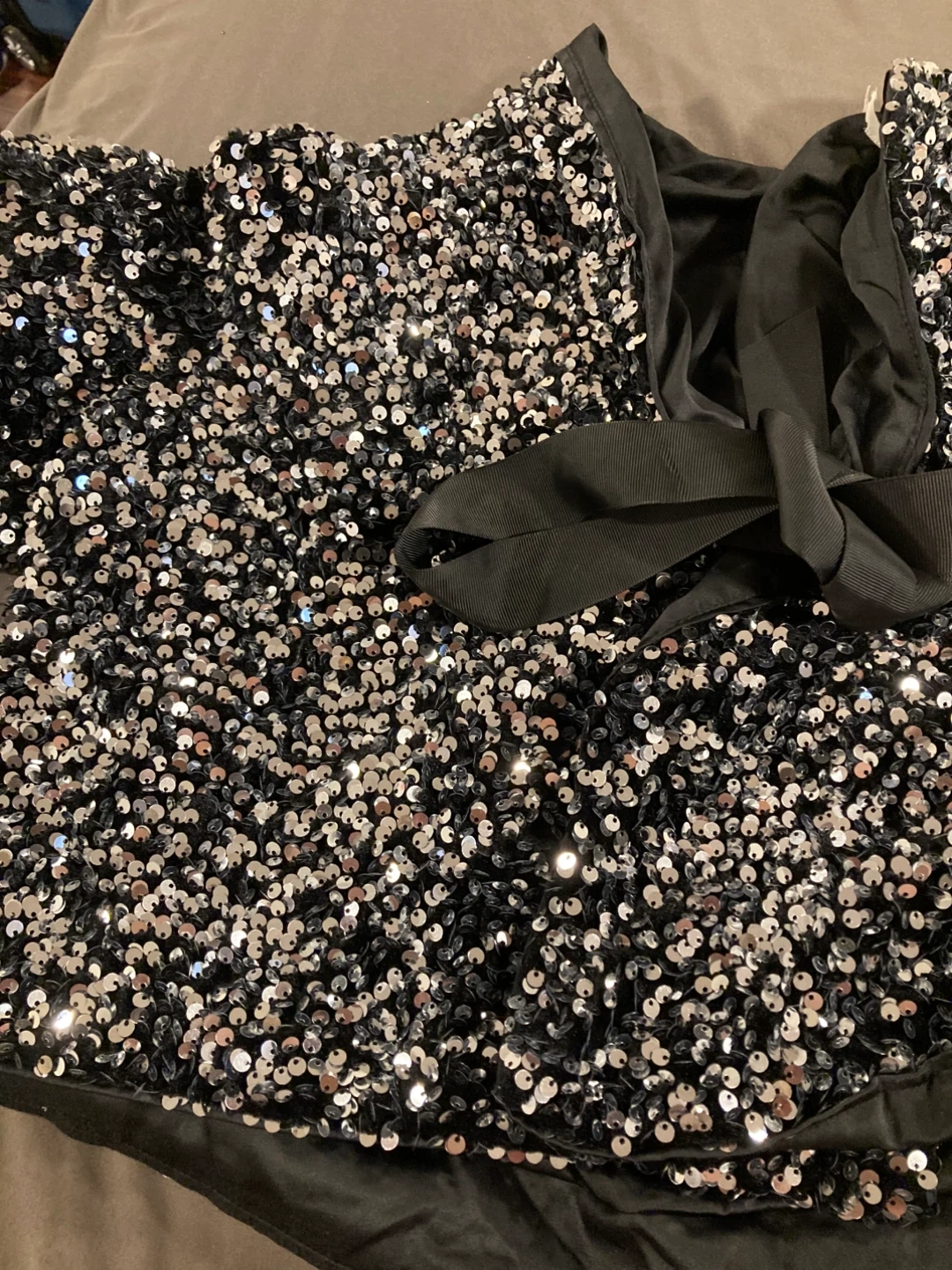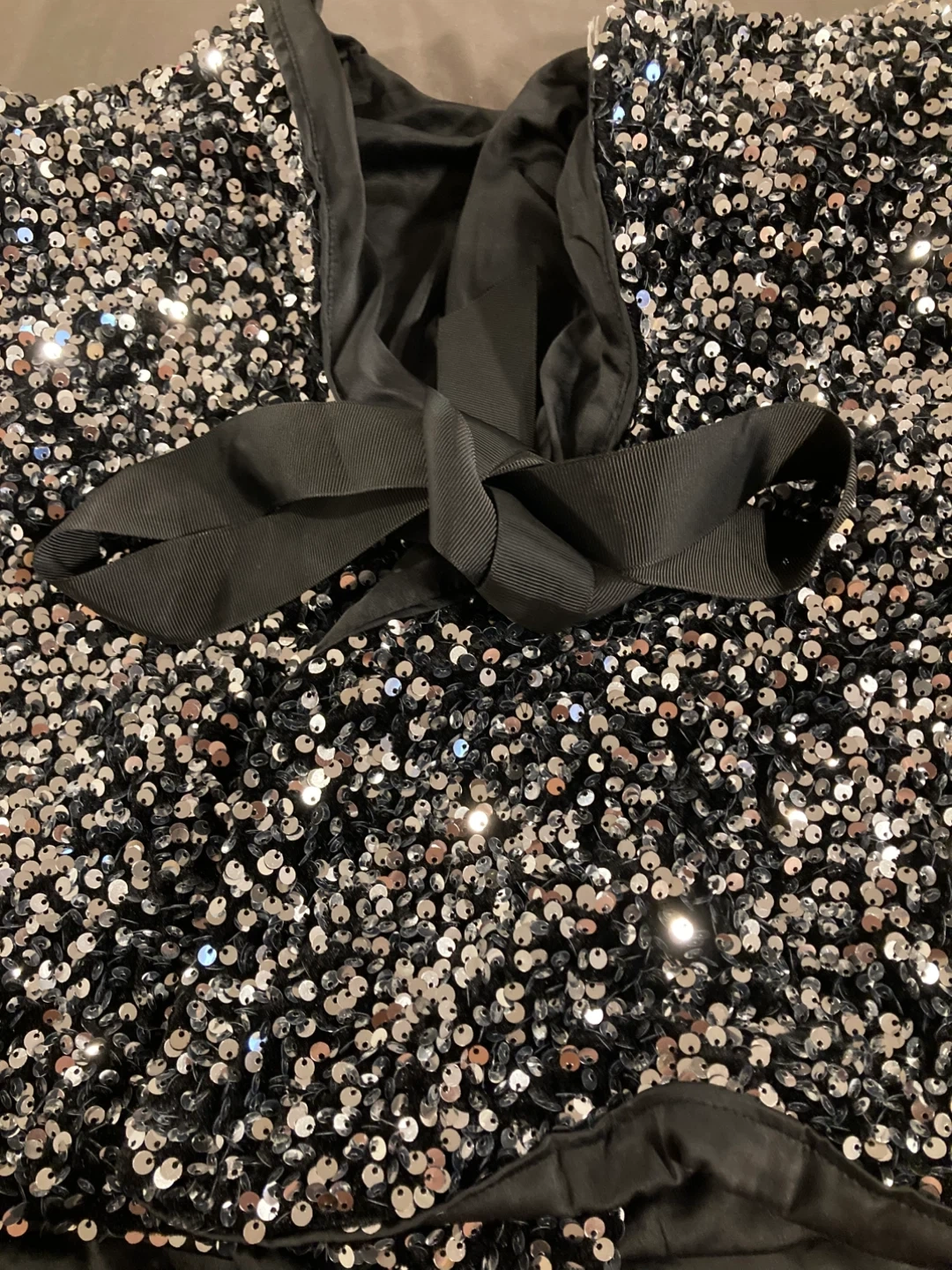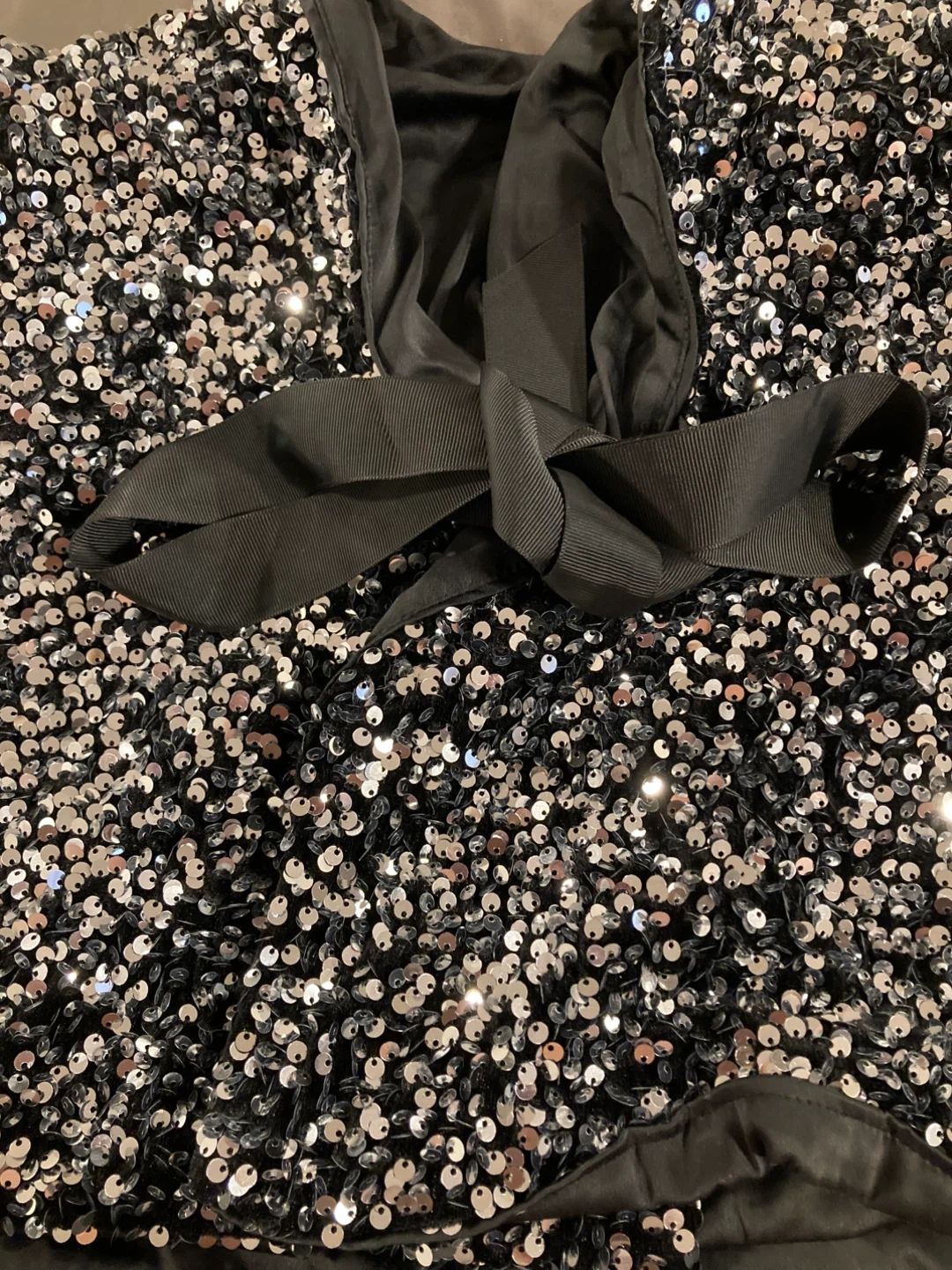 This sparkly Blazer is covered in shimmering sequins and features a chic black ribbon tie at the back. It's perfect for a night out or a special occasion!