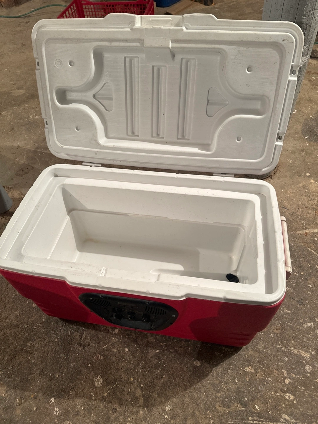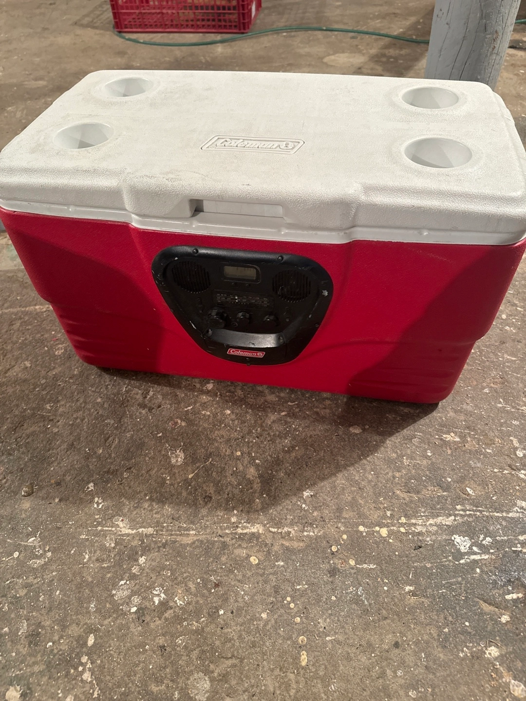 Red and white Coleman cooler with four cup holders on top. It has a built-in digital display speaker on the front. Great for parties and outdoor events!