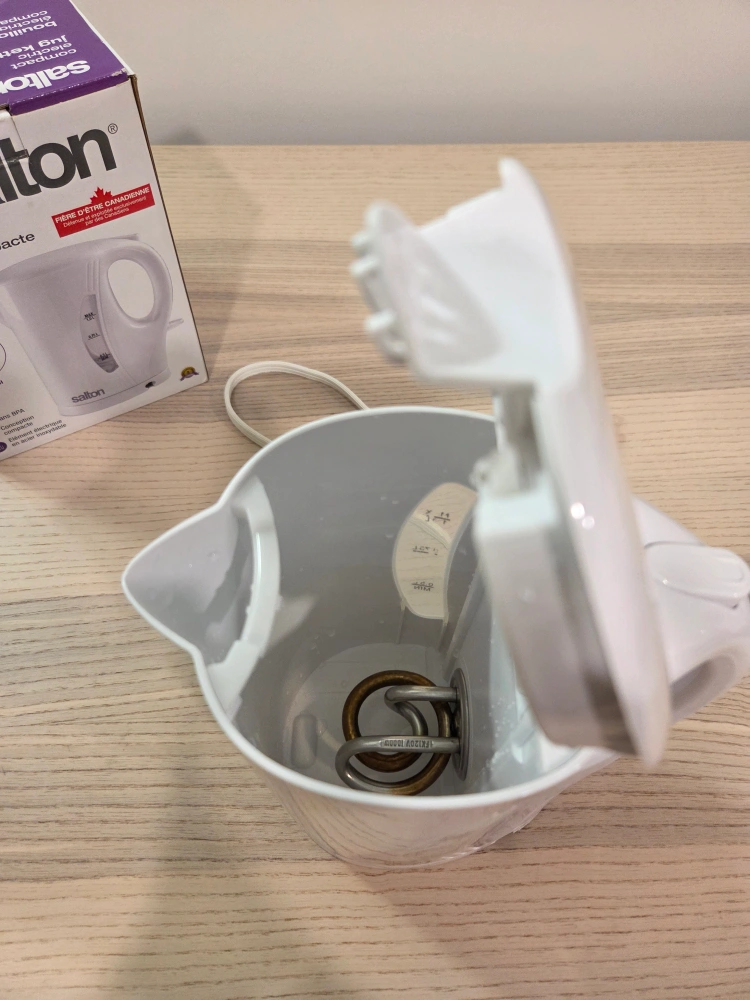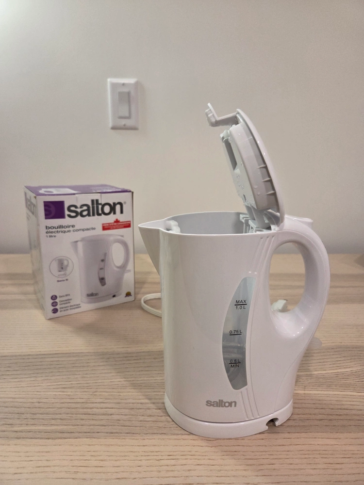 This is a white Salton compact electric kettle with a 1-litre capacity. It has a water level indicator and a concealed heating element. It's perfect for quickly boiling water for tea, coffee, or other hot beverages.