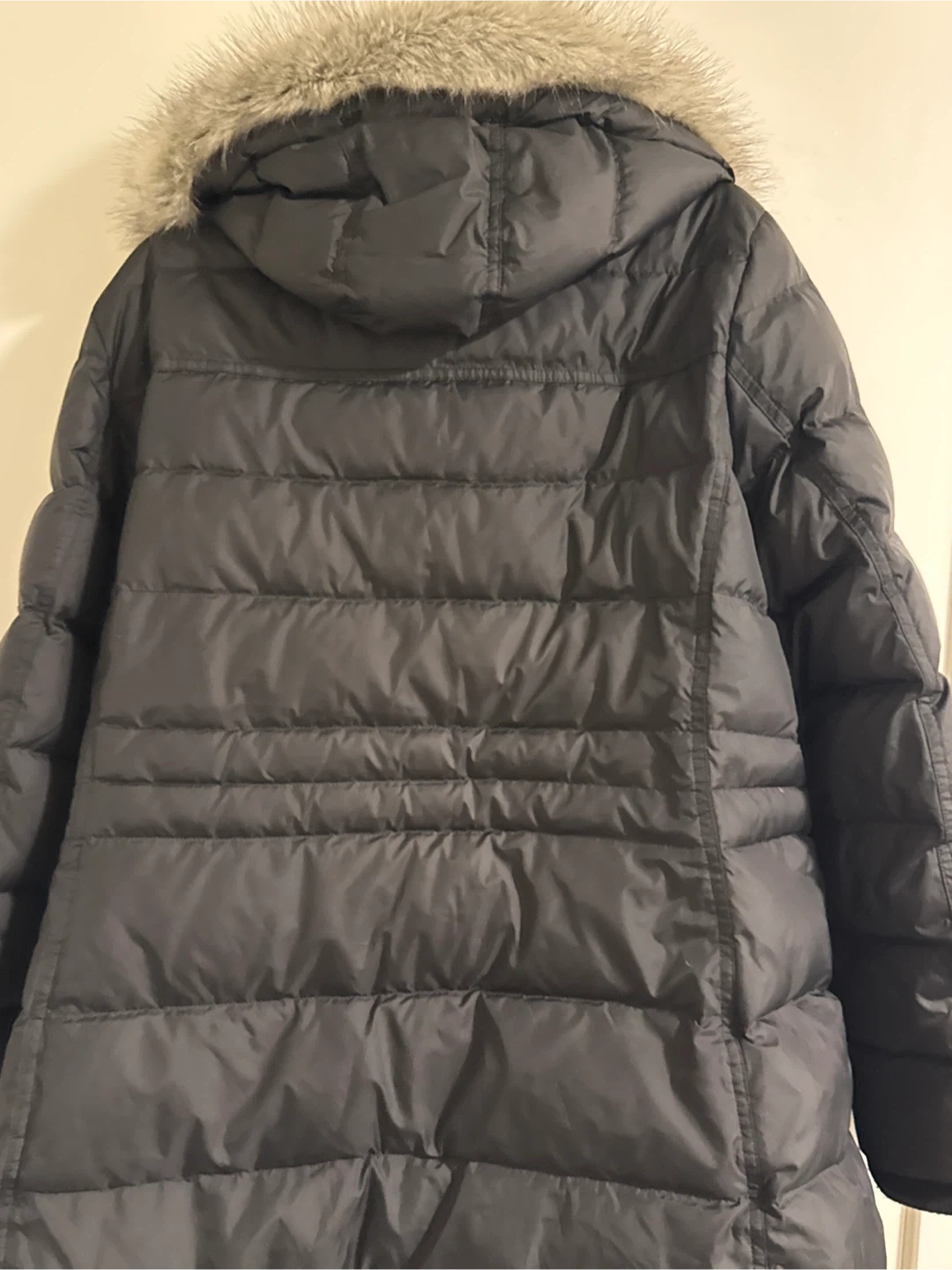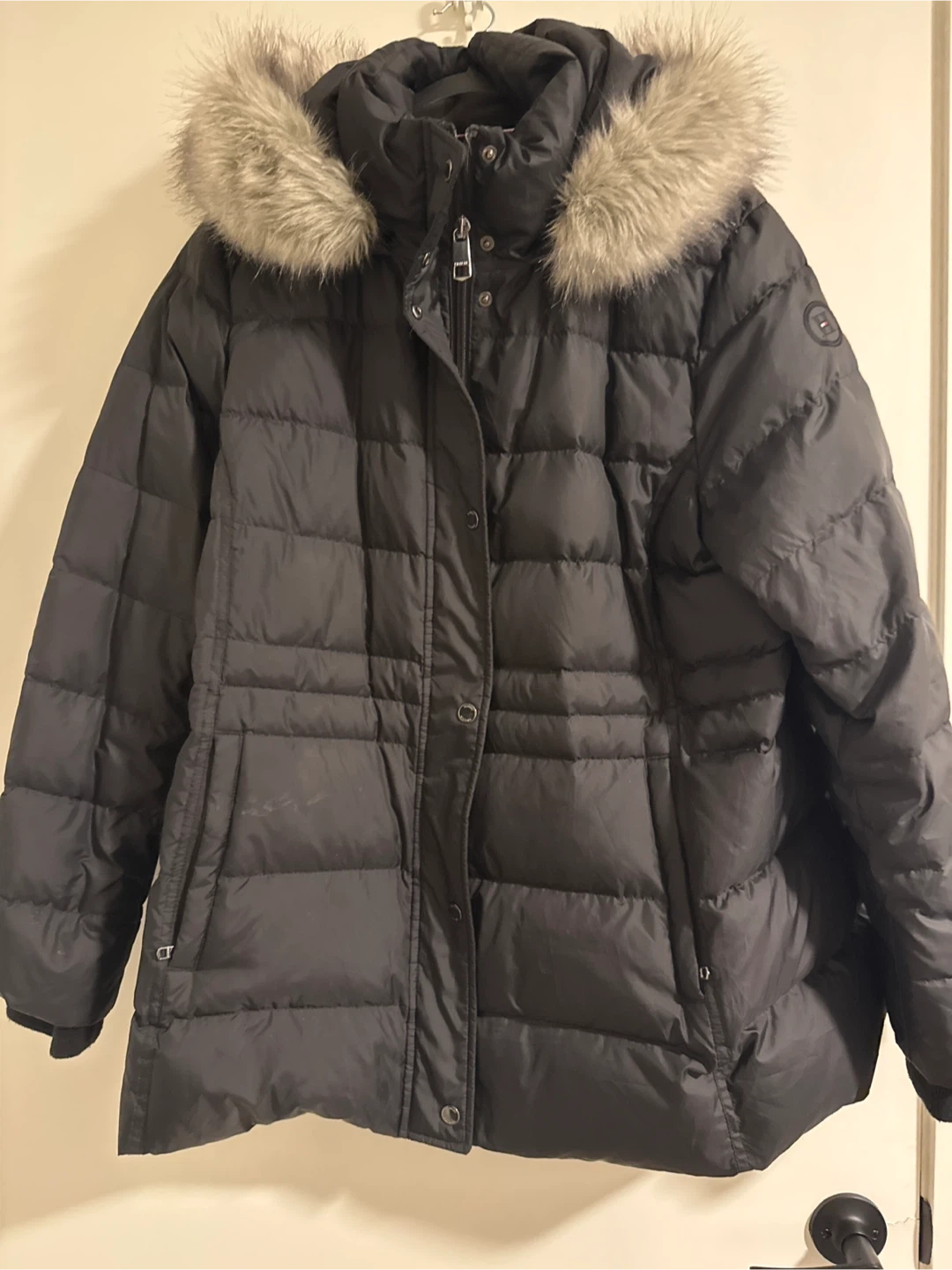 Dark grey puffer coat from Tommy Hilfiger. It features a detachable fur-lined hood and a full zip-up front with button closure. A practical winter coat for staying warm.