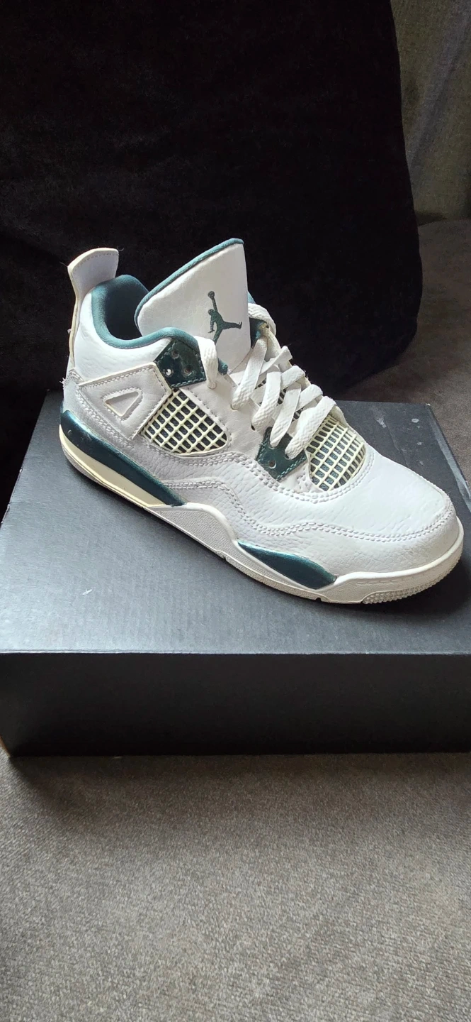Air Jordan 4 Retro sneakers in white, true blue, and grey. Includes original box. Perfect for little ones starting their sneaker collection! Size 1 kids