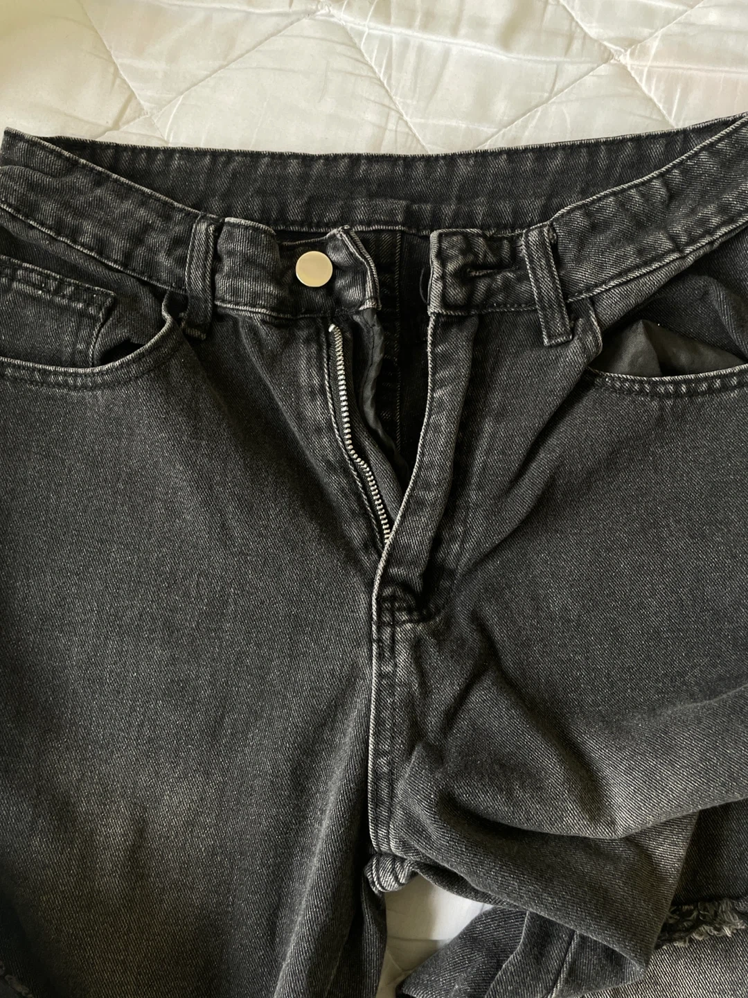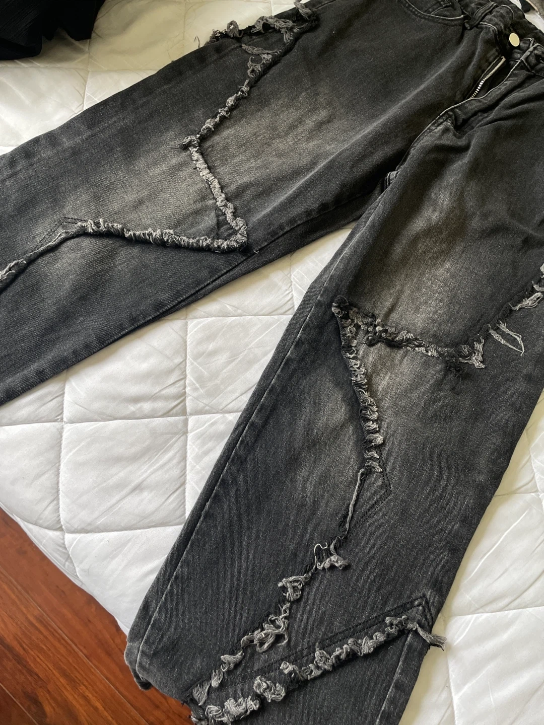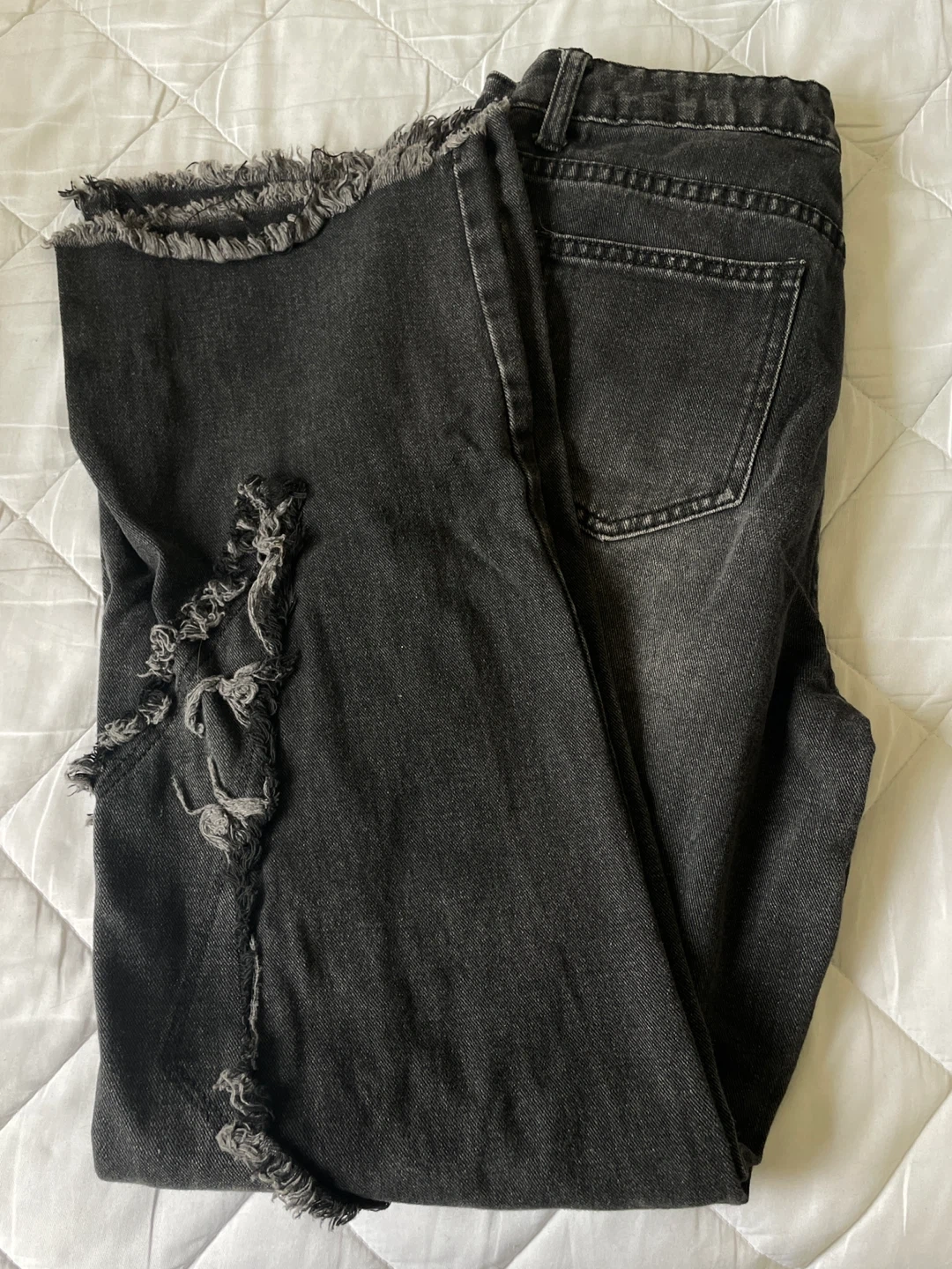 These black denim jeans feature a distressed design with unique frayed detailing along the legs. They have a classic five-pocket style with a zip fly and button closure. Looks like they're ready for a new wardrobe!