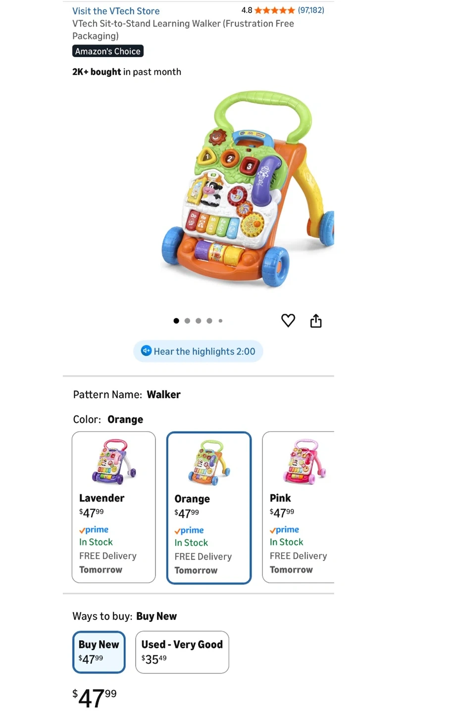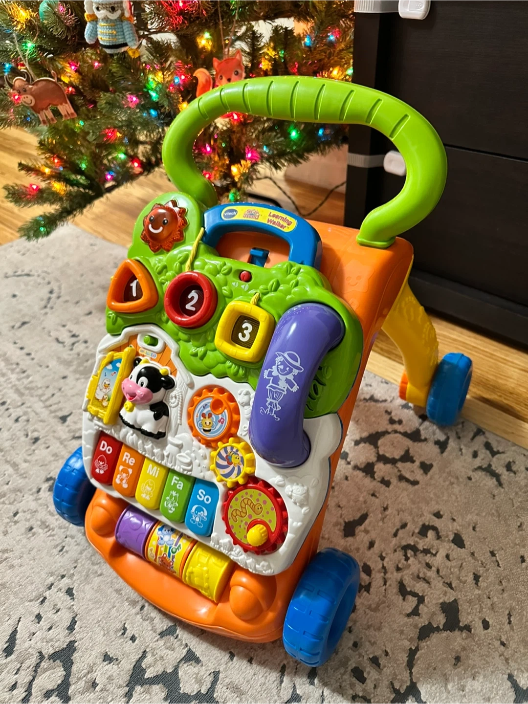 I'm selling a VTech Sit-to-Stand Learning Walker in orange! It is in a great condition, like new. It's a fun and interactive way for babies to learn and explore as they grow. It has a variety of activities to keep your little one entertained and help them develop their motor skills. Perfect for babies who are learning to sit, stand, and walk.