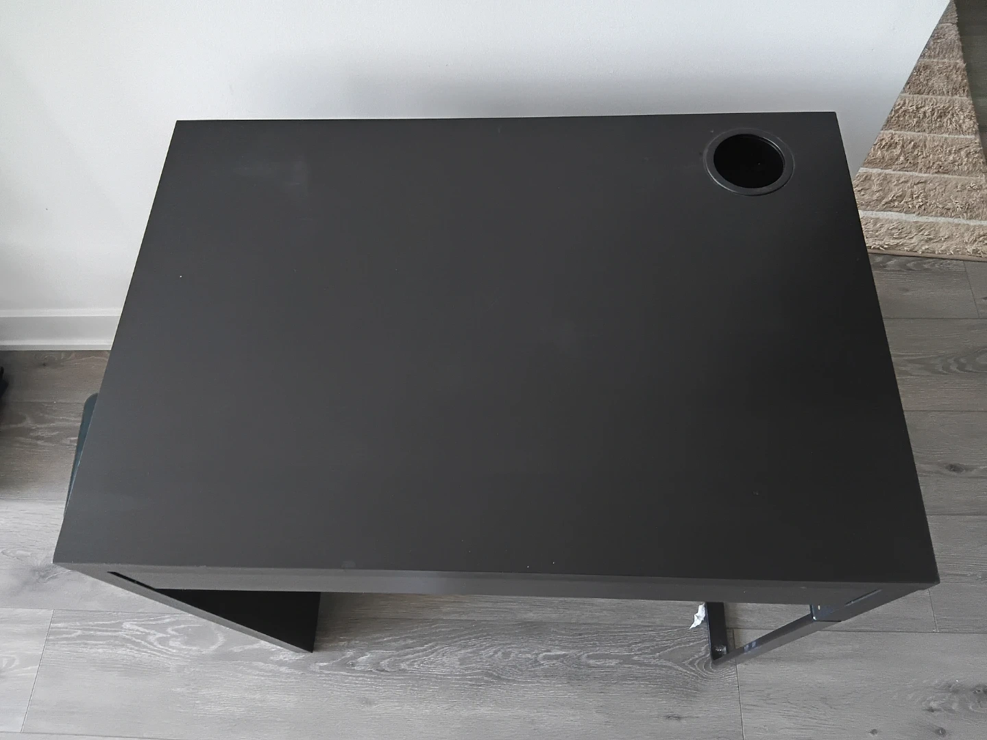 Black desk featuring a single drawer for storage. It has a convenient cable management hole on the tabletop. This desk is perfect for a smaller workspace.