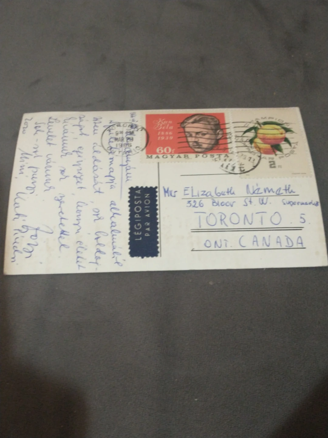 3 1/2" x 5 1/2" photo postcard of St. Istvan (Stephan) statue in Budapest in box 5. Mailed to Toronto in 1996.