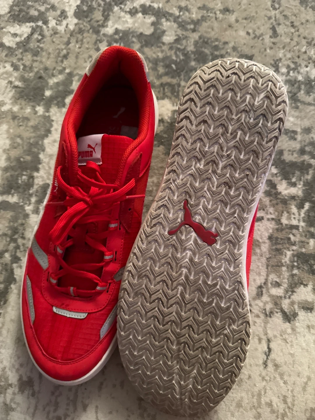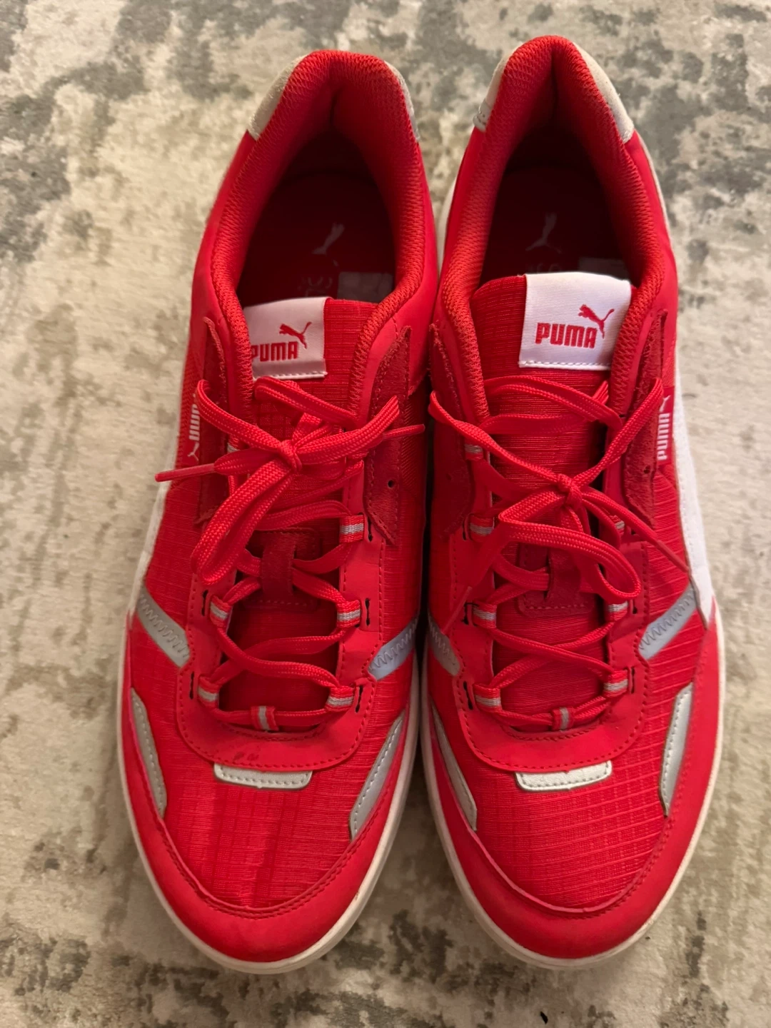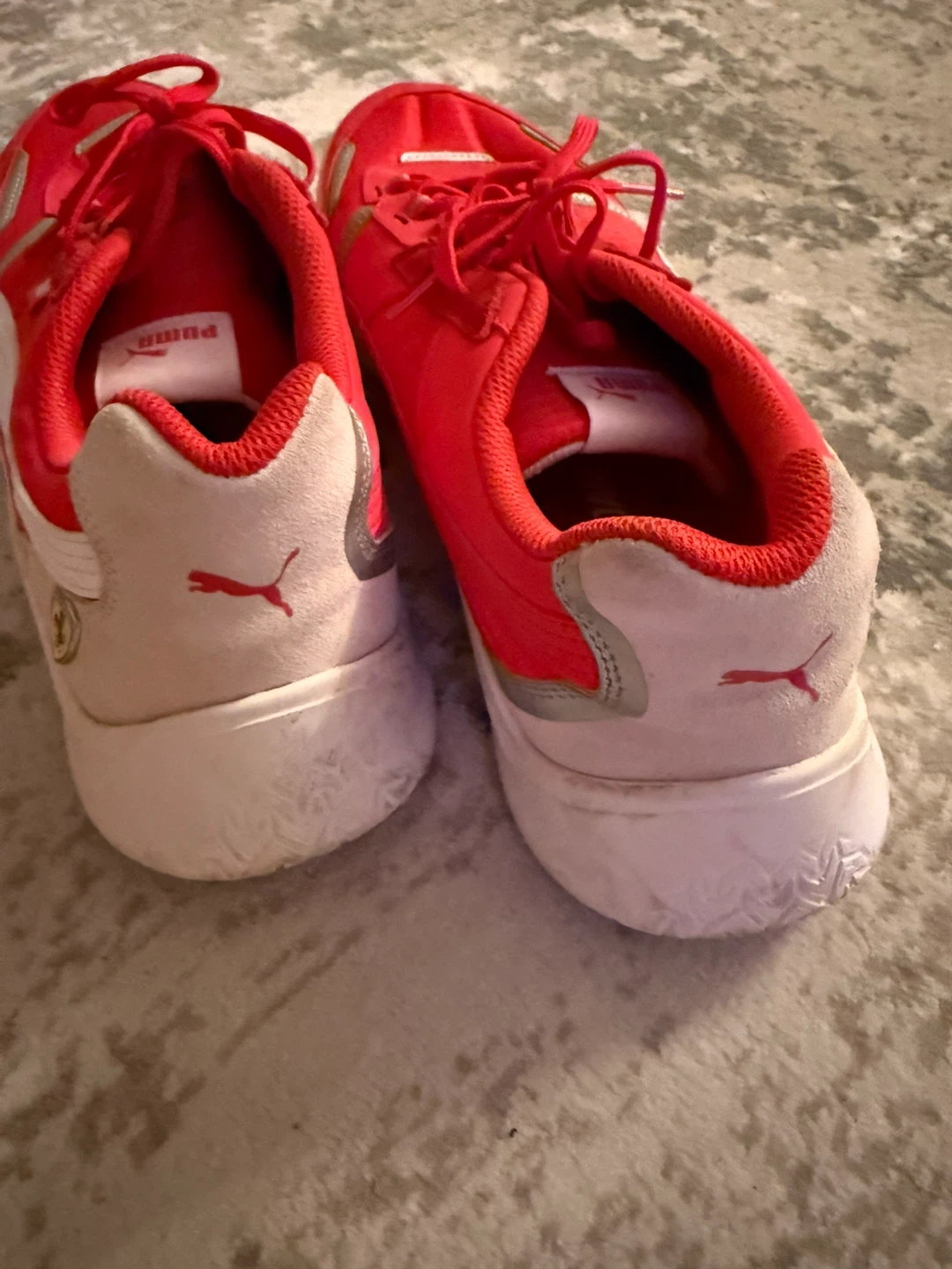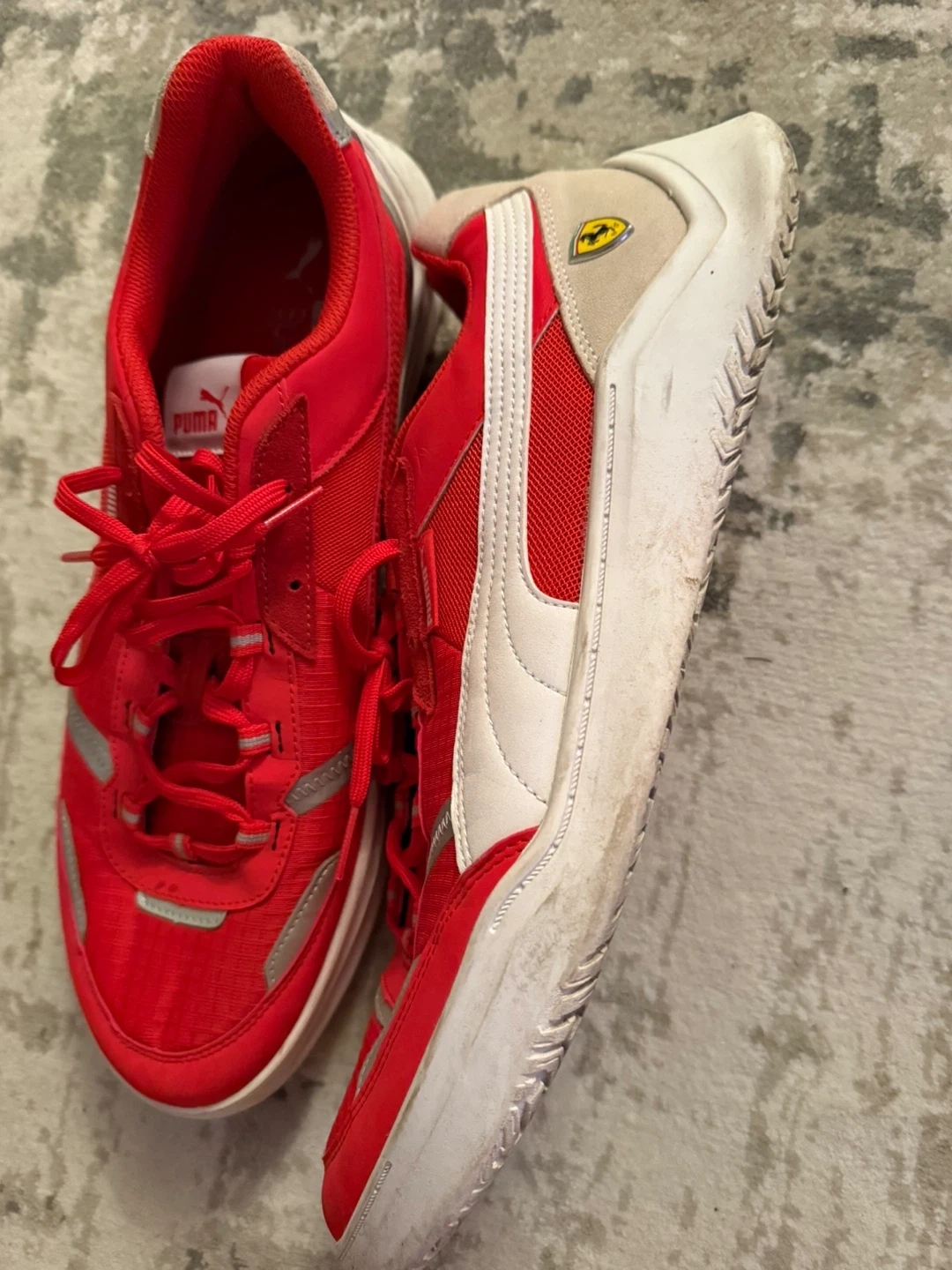 Red and white Puma Scuderia Ferrari Kart Cat III shoes. Size 14 US men's. Designed for comfort and style.
