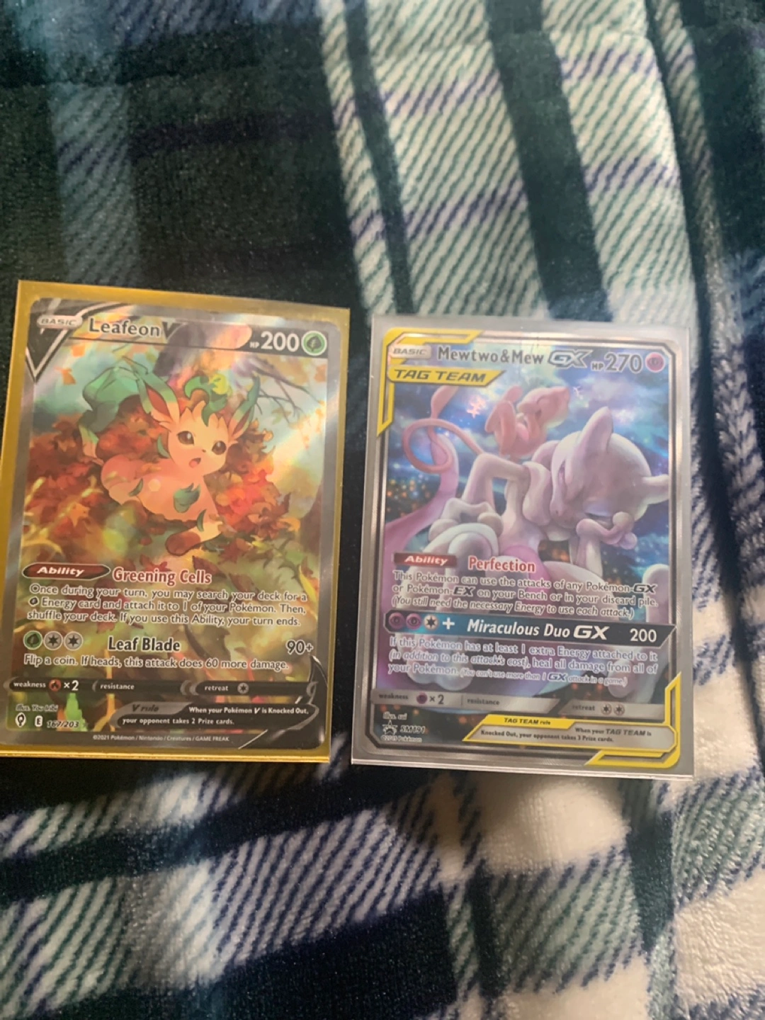 Two Pokemon cards. Leafeon V and Mewtwo & Mew GX. The Leafeon has a mark on the top of the card and the Mew and Mewtwo has damage also on the top. On eBay, in NM condition the cards go for about $300+ CAD. Due to the damage I’m selling for $150. The Mew & Mewtwo are more damaged so I’m selling it for $100 (About $110 off NM price). The Leafeon However has limited damage and will also be sold at $100 (About $30 off NM price). Great addition to any collection. Feel Free to message offers and for more details on the cards. Also willing to combine my other listing for a Disney Lorcana Bundle Box for an additional $75 if you buy all together ($225 total). Always open to trades as well! Thank you!