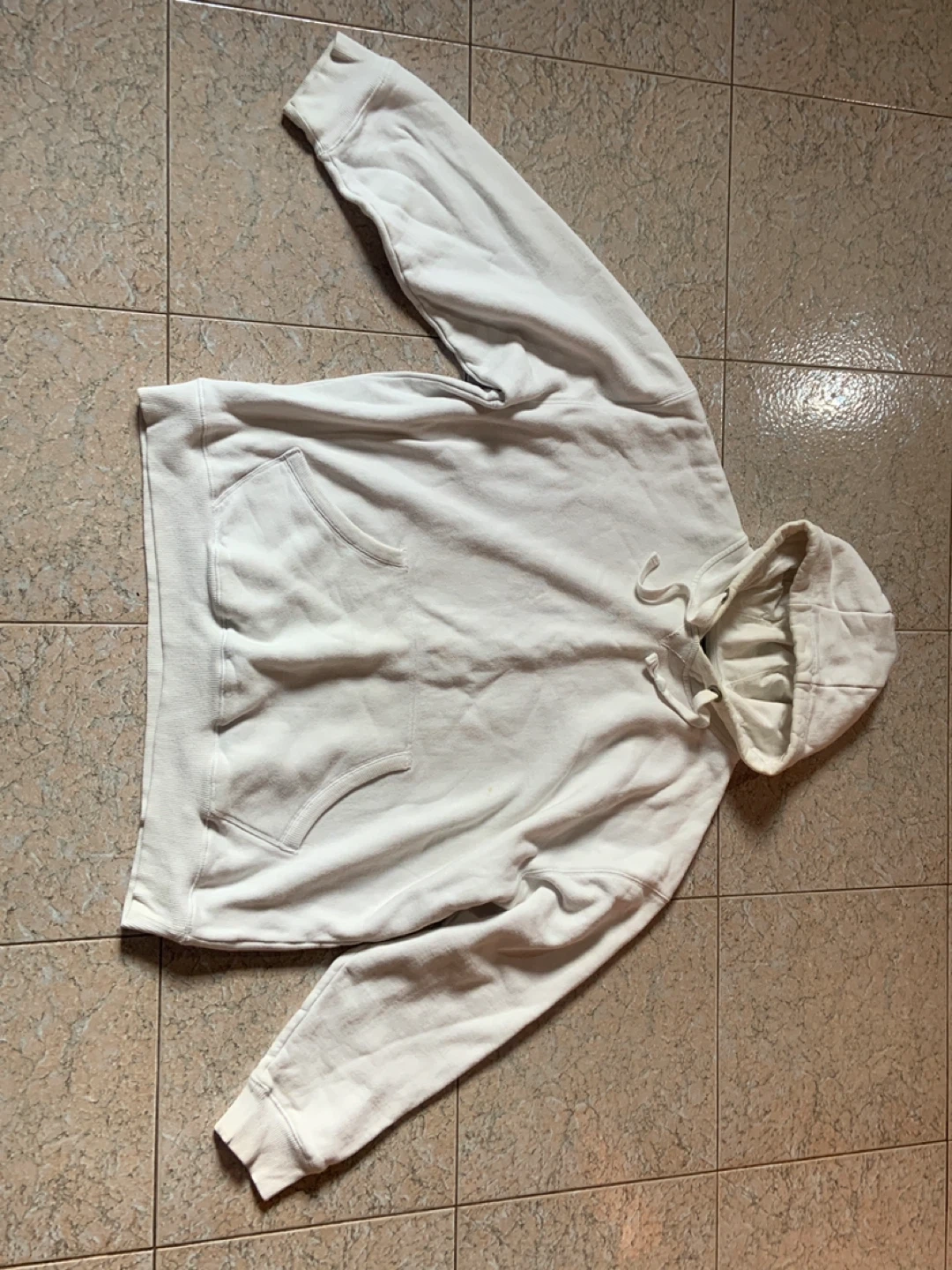 This is a comfortable white pullover hoodie. It features a front kangaroo pocket and a drawstring hood. It's made of a soft cotton blend.