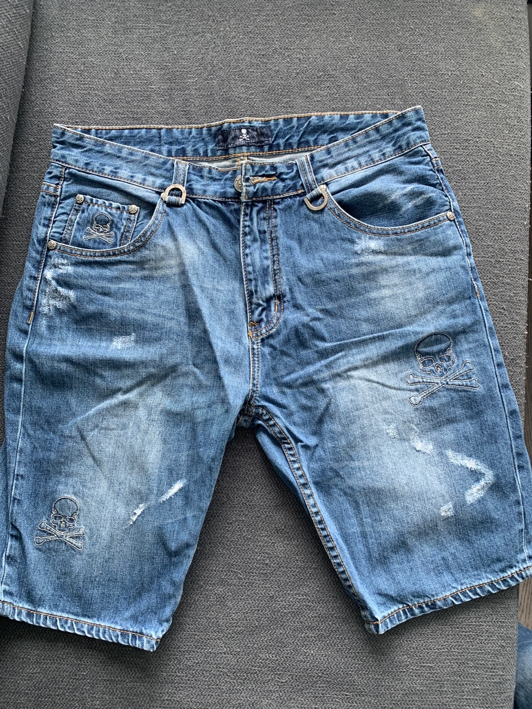 Lightly distressed denim shorts. Embroidered skull details. Classic five-pocket styling. Great summer shorts.