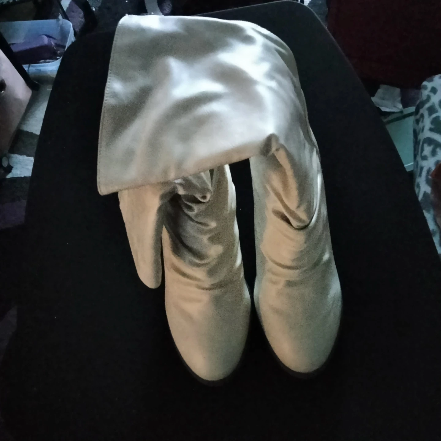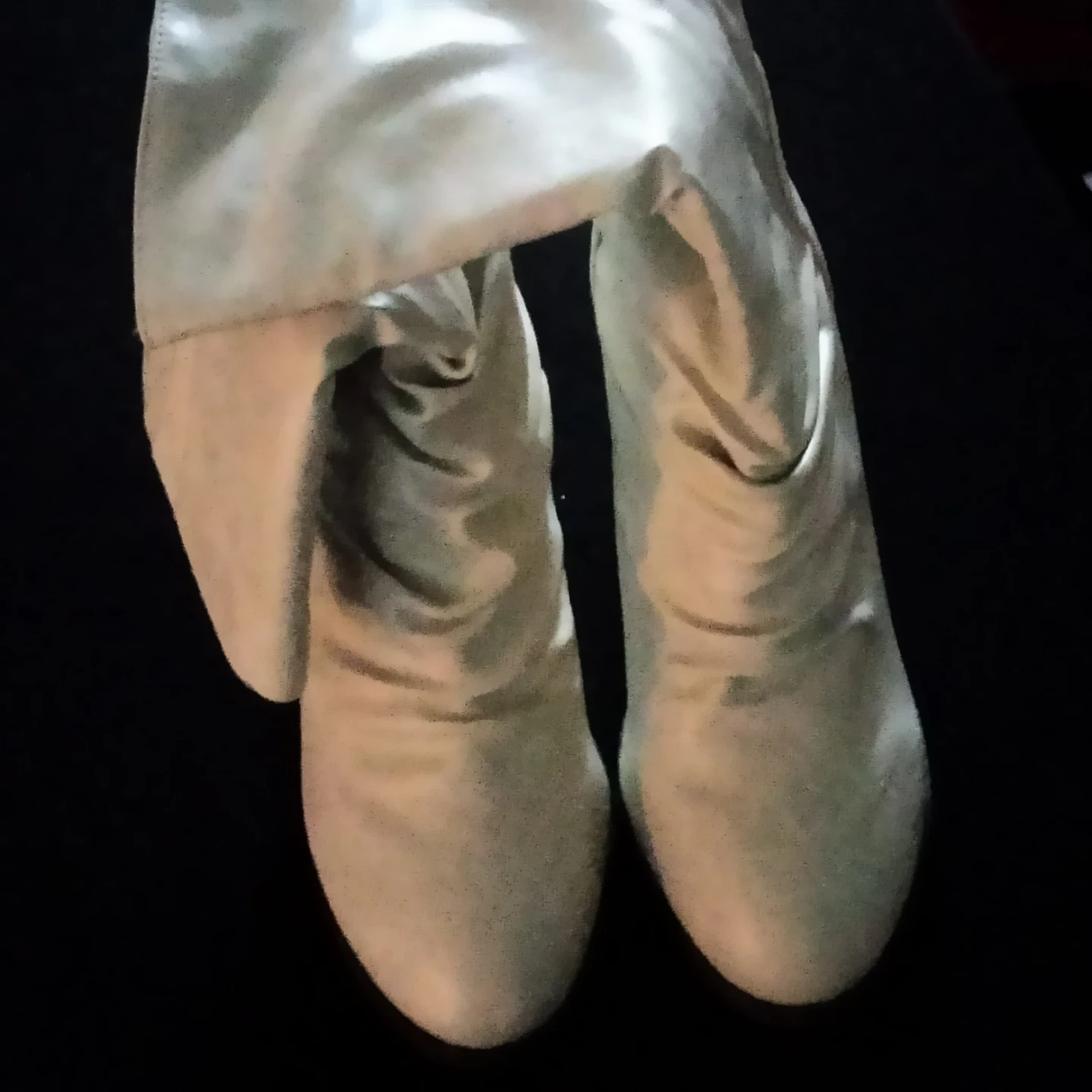 These women's knee-high boots are a creamy, neutral color. They have a slouchy, ruched shaft and a comfortable low heel. Perfect for adding a stylish touch to your fall and winter outfits!