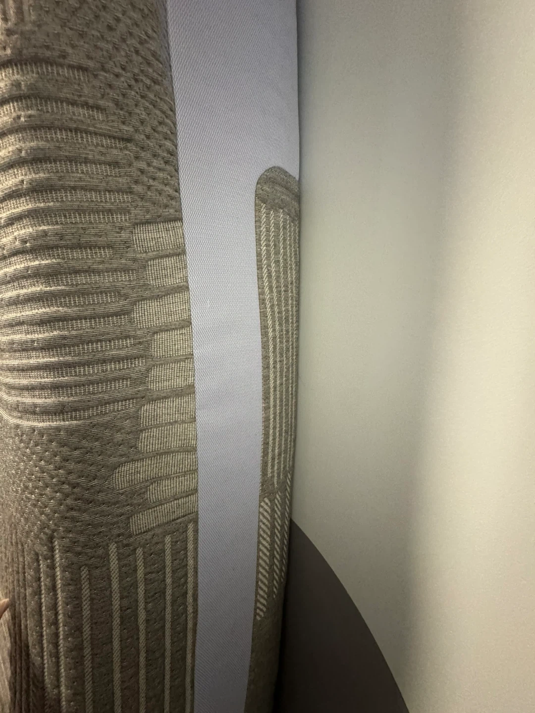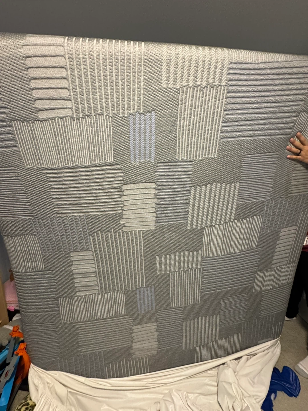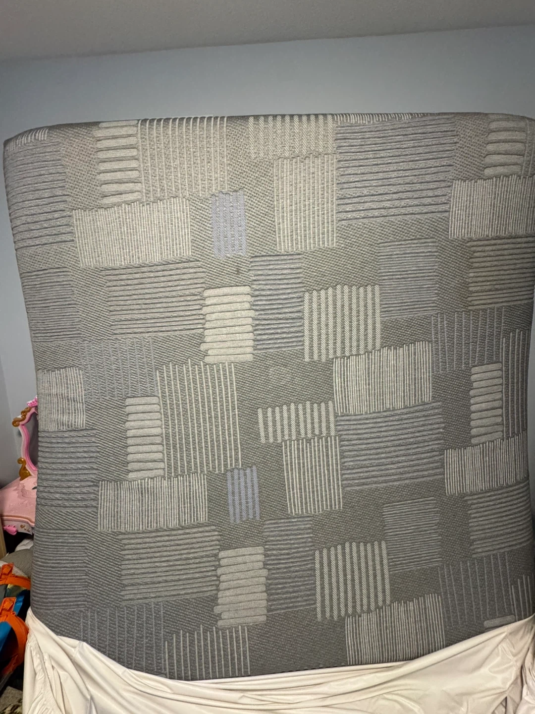 This is the Kluft Grandeur bed base. It features a patterned gray fabric cover. This is a king size base brand new in box.