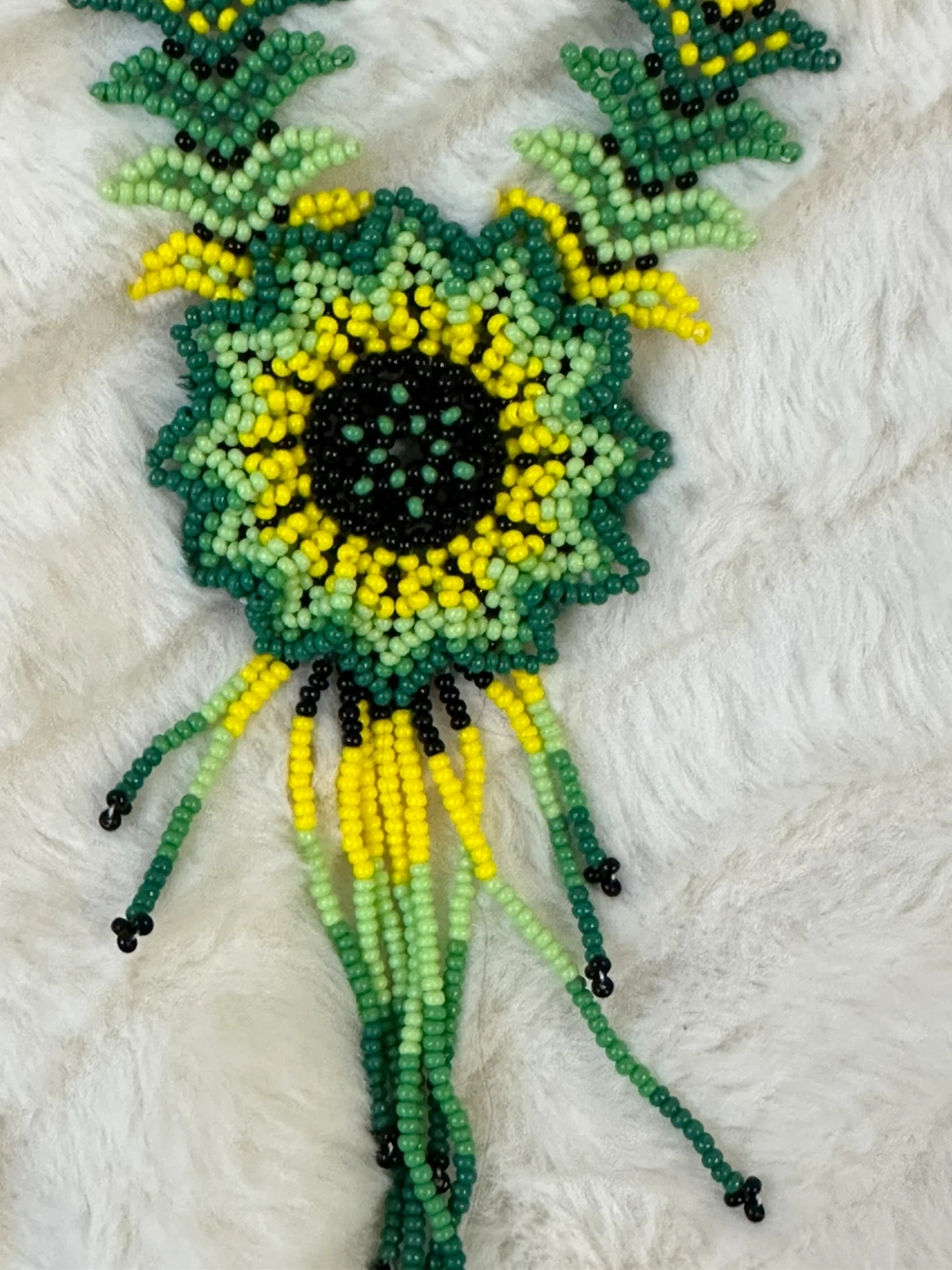Beautiful handcrafted necklace and matching earrings made with small green and yellow glass beads (chaquira), inspired by traditional Mexican Huichol art.
