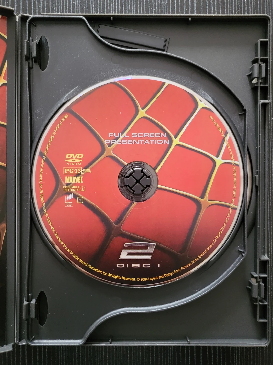 This is the "Full Screen Special Edition" of Spider-Man 2 on DVD. It's a two-disc set with "Disc 1" featuring the main film and "Disc 2" containing special features. The set includes commentary, behind-the-scenes documentaries, and more.