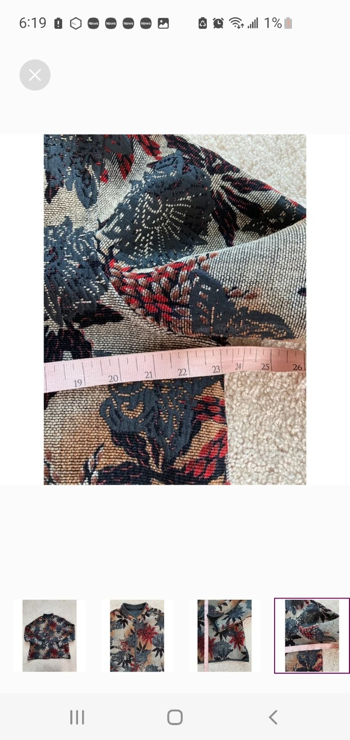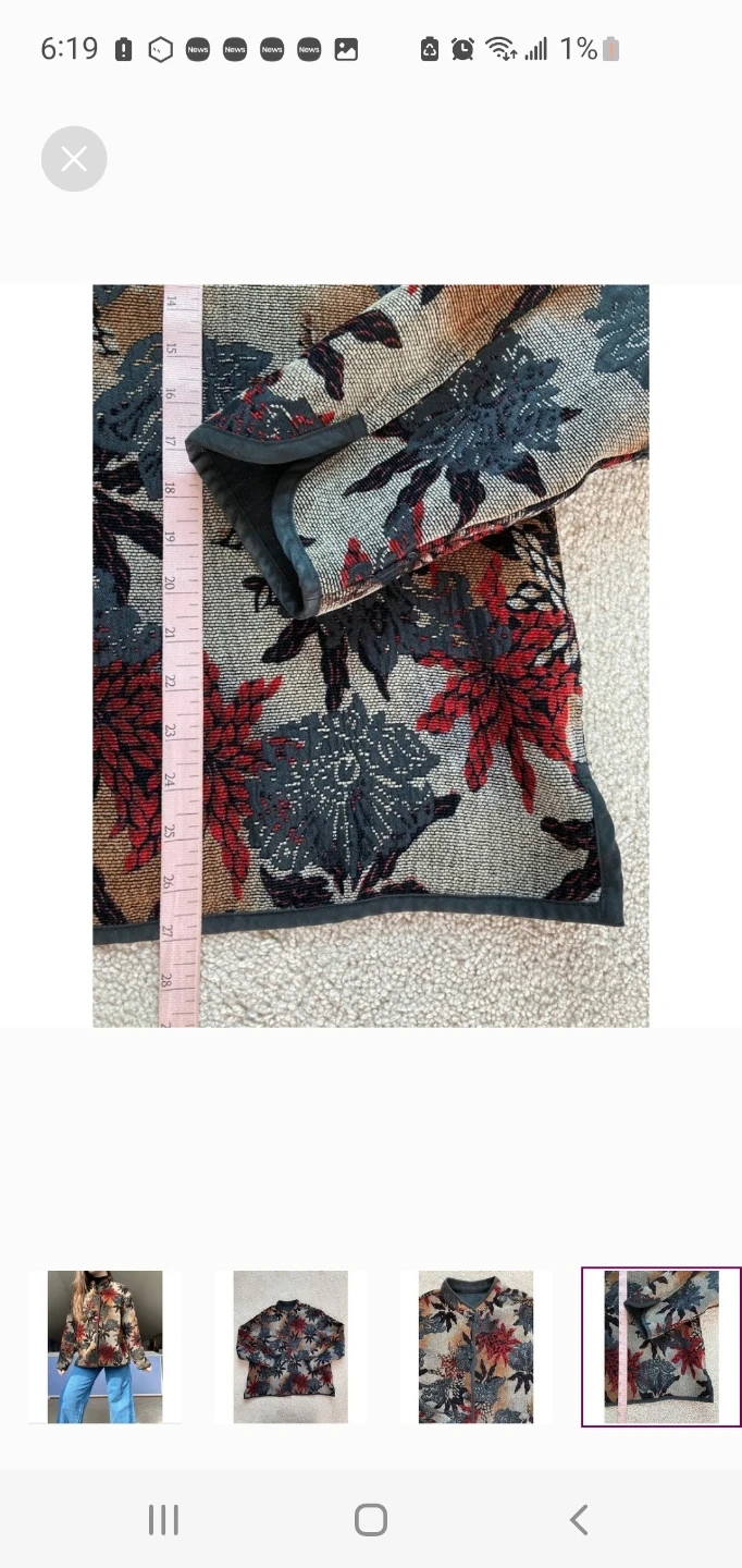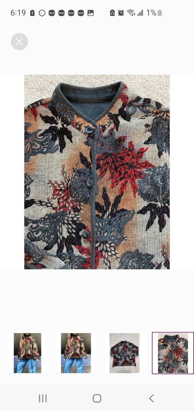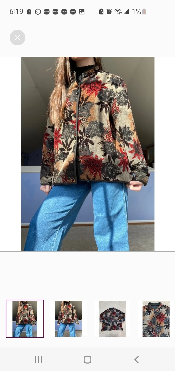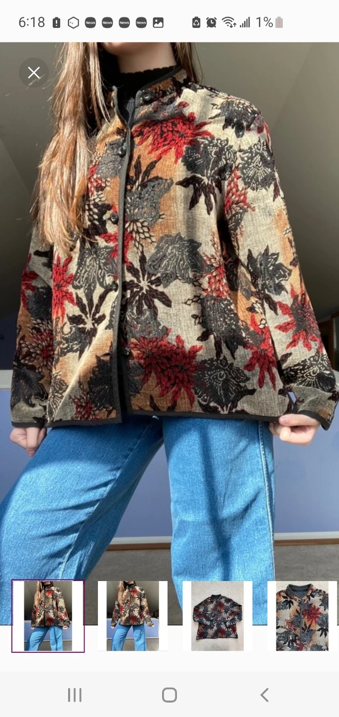 Colorful floral print jacket with a collared neckline and button closure. It's made from a woven tapestry-like material. Great for layering! Estimated size large. See photos for measurements. Cash only, please.
