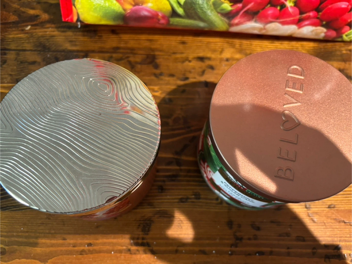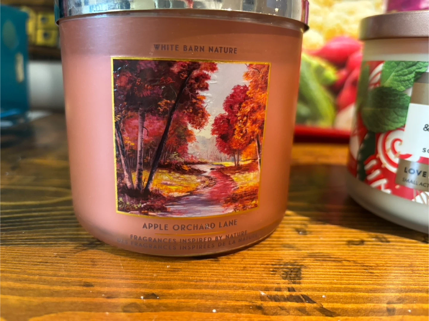 Two three-wick candles. One is "Apple Orchard Lane" from White Barn Nature. The other is a "Limited Edition Beloved Peppermint & Sugar Cane" vegan scented candle from Love Beauty And Planet. They're ready to add a nice aroma to your space!