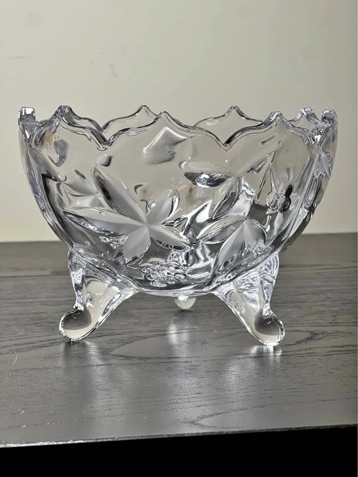 Beautiful Mikasa Garden Terrace crystal bowl with a lovely etched grape and leaf pattern. It has a scalloped rim and stands on three decorative feet. This discontinued pattern makes it a great collectible. Perfect for candy, nuts, or as a decorative accent. Pre-owned. Pickup is at 58th and 7th Ave in midtown Manhattan.