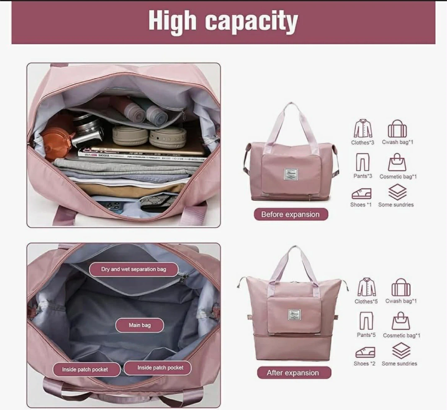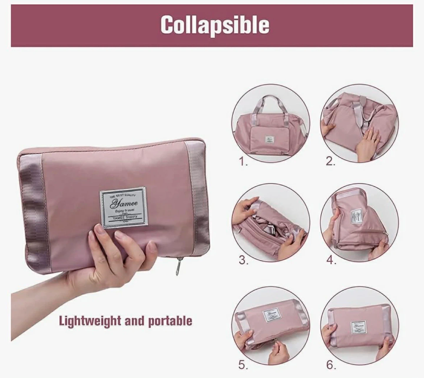 This pink duffel bag is made from high-density oxford fabric. It's water-resistant and lightweight. The bag features reinforced stitching, a textured zipper, and a pocket that can hold a phone.
