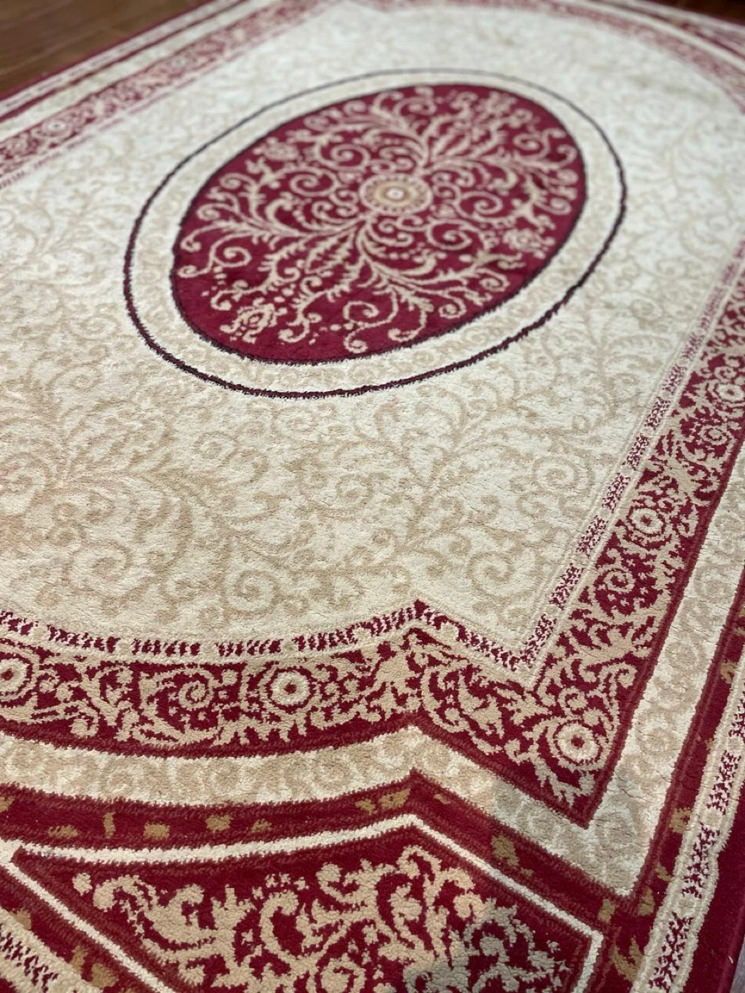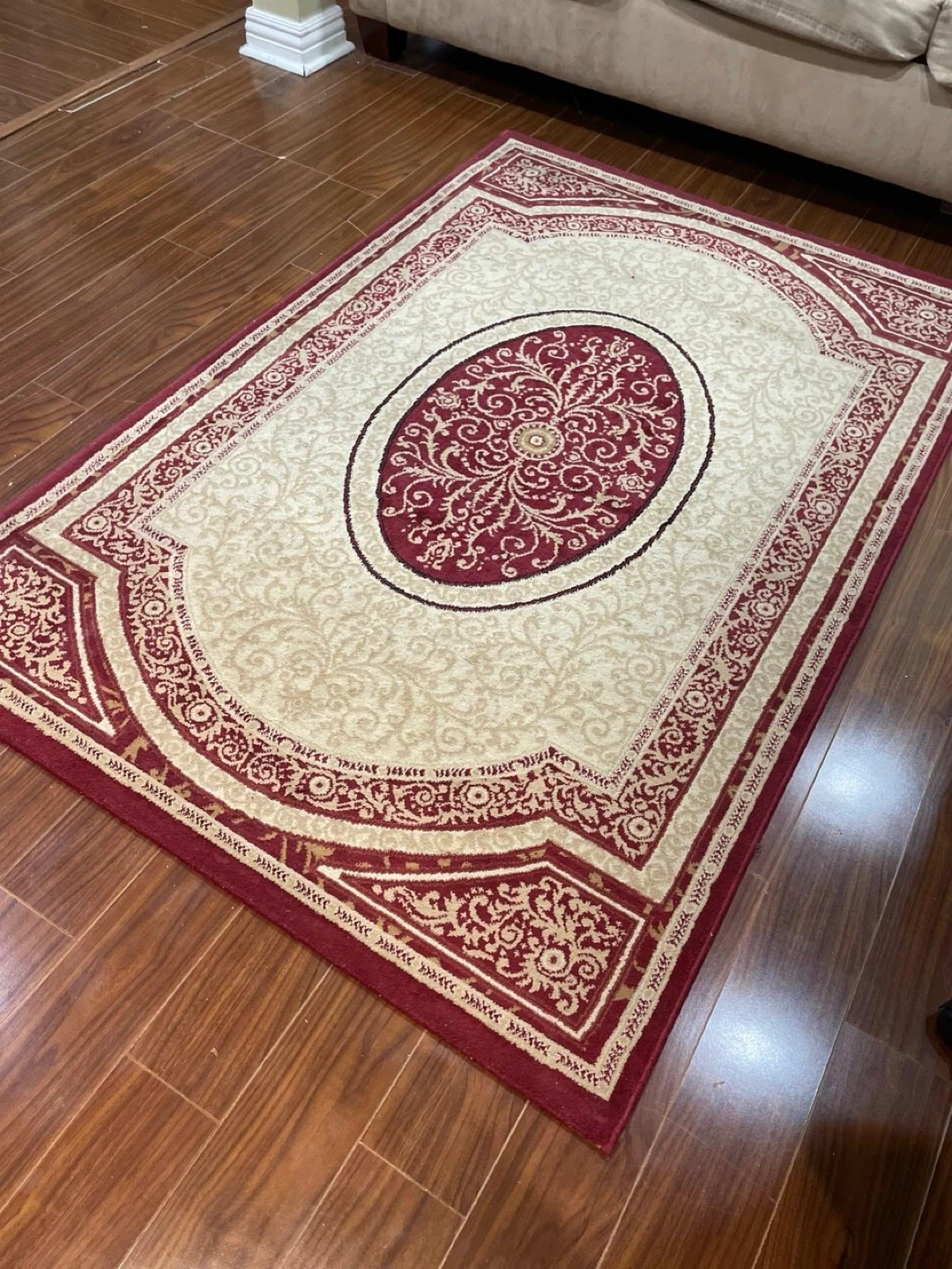 This is a rectangular area rug with a traditional design. It features a cream-coloured centre with an oval medallion in burgundy. The border is also in burgundy with an intricate pattern. It's a nice accent for a living room or bedroom! Rug size 5x7 feet