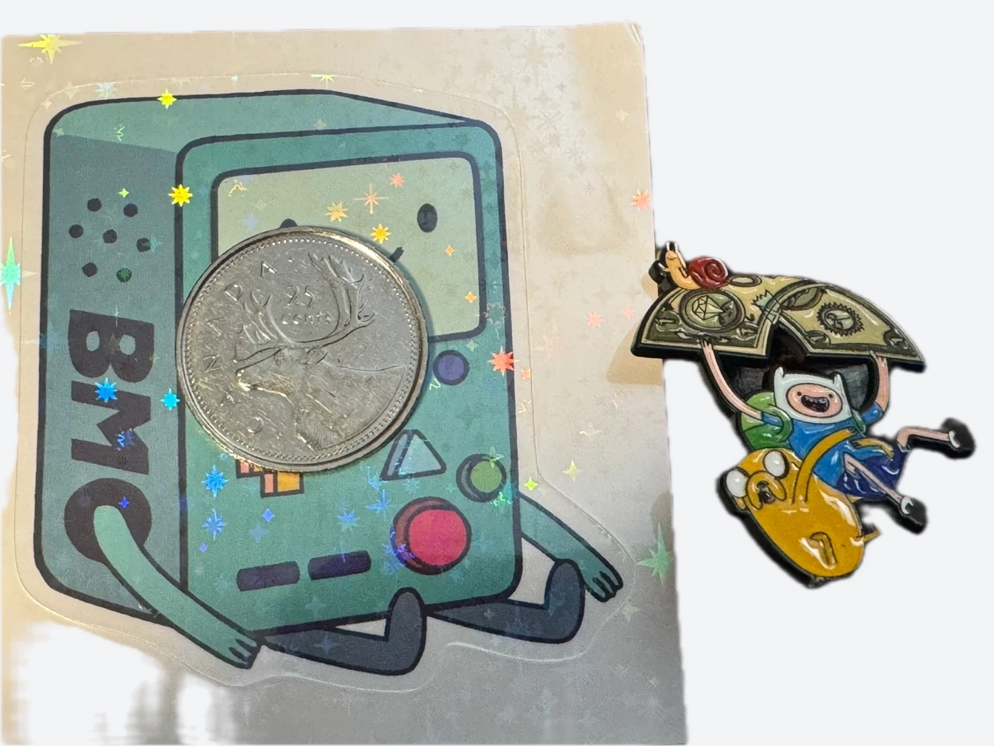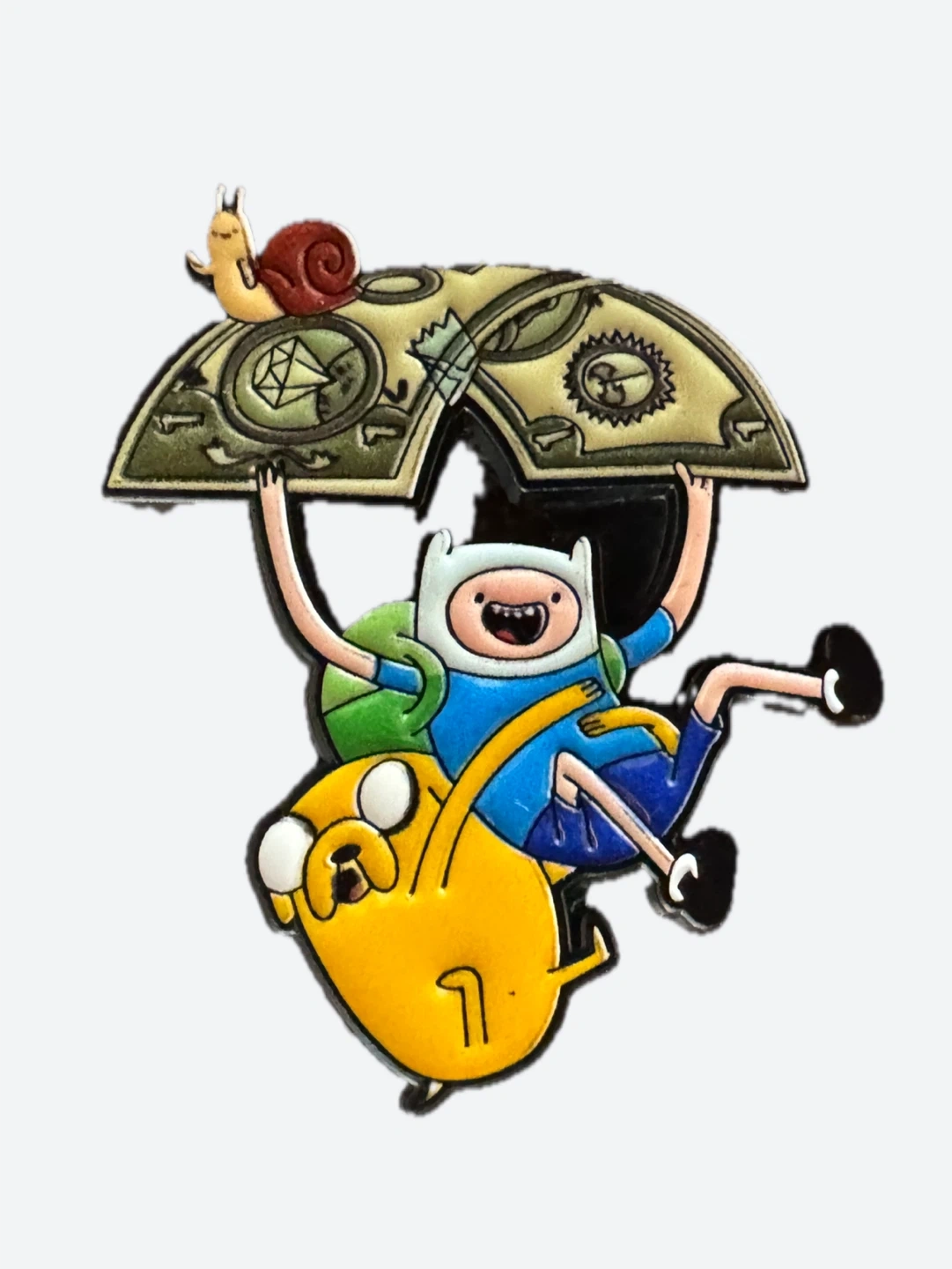 1 enamel pin showcasing Finn and Jake from Adventure Time, complete with a money umbrella and a snail perched on top.