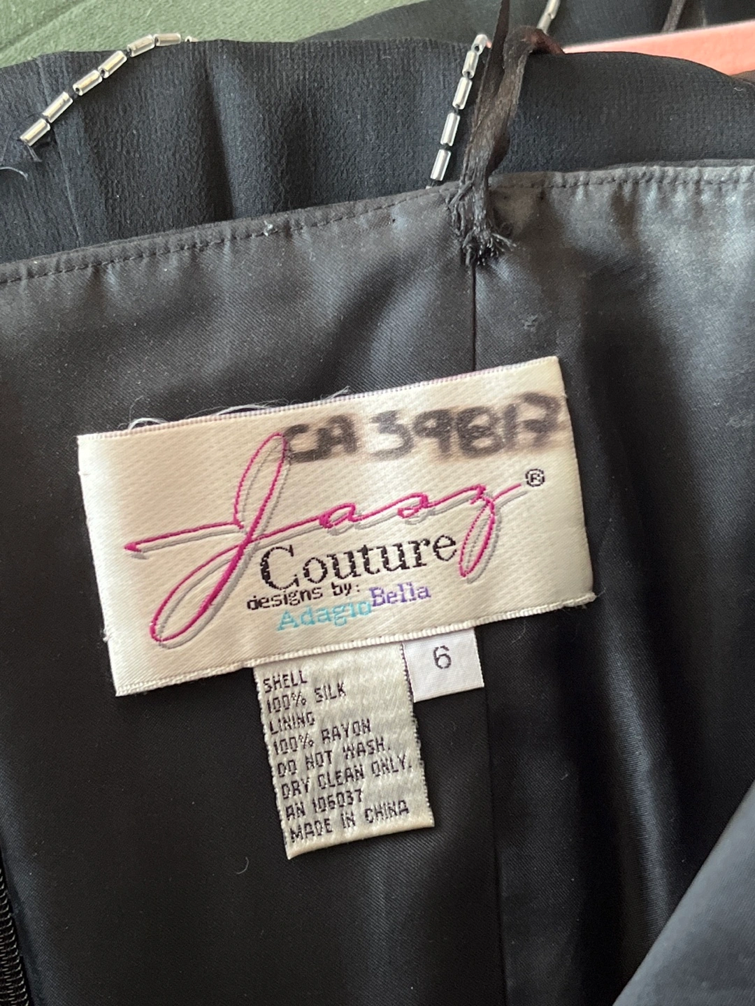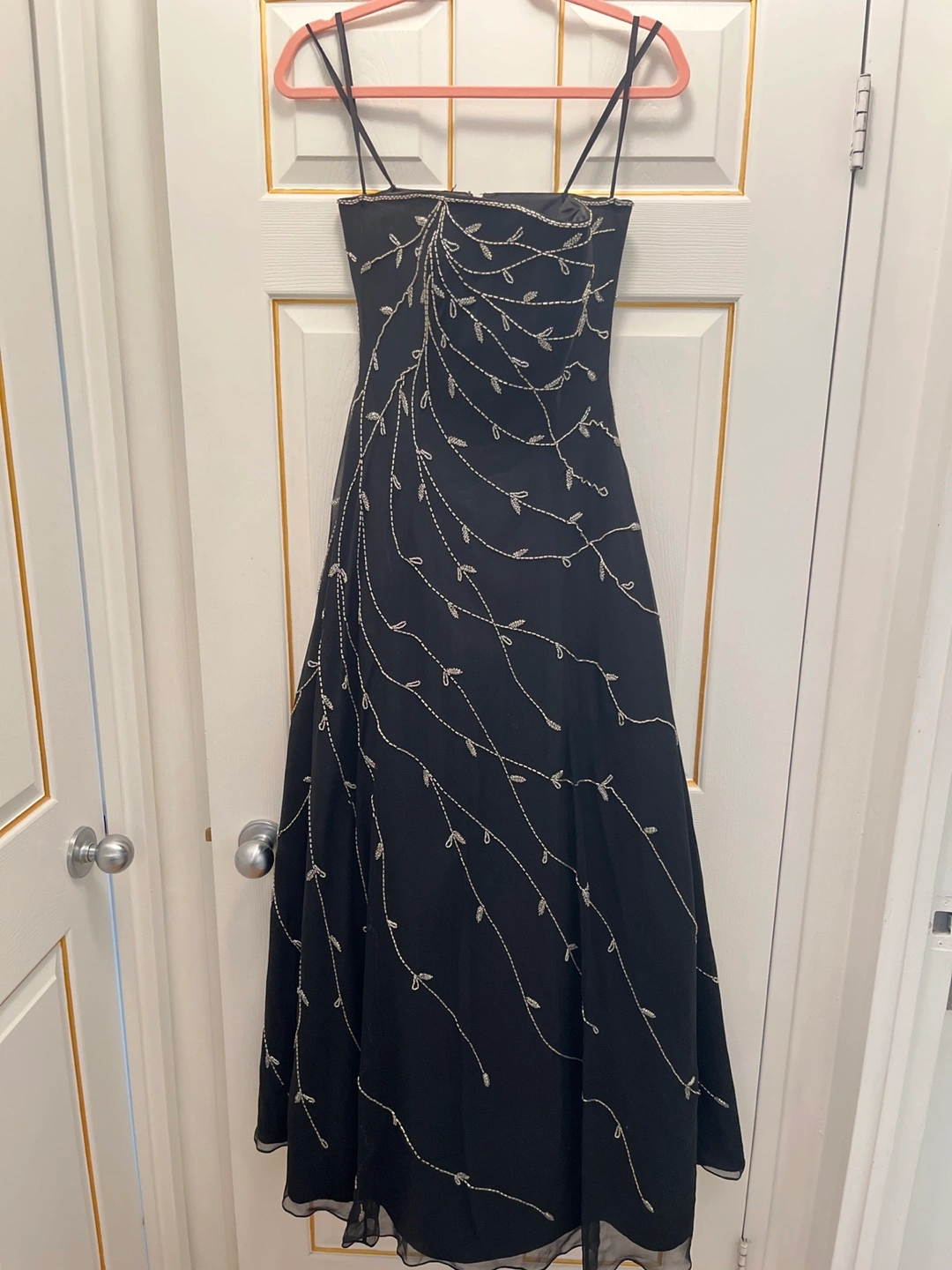 Stunning floor-length black gown. Features delicate silver beading in a leaf pattern. Strapless, A-line silhouette. Dry clean only. Made in China.