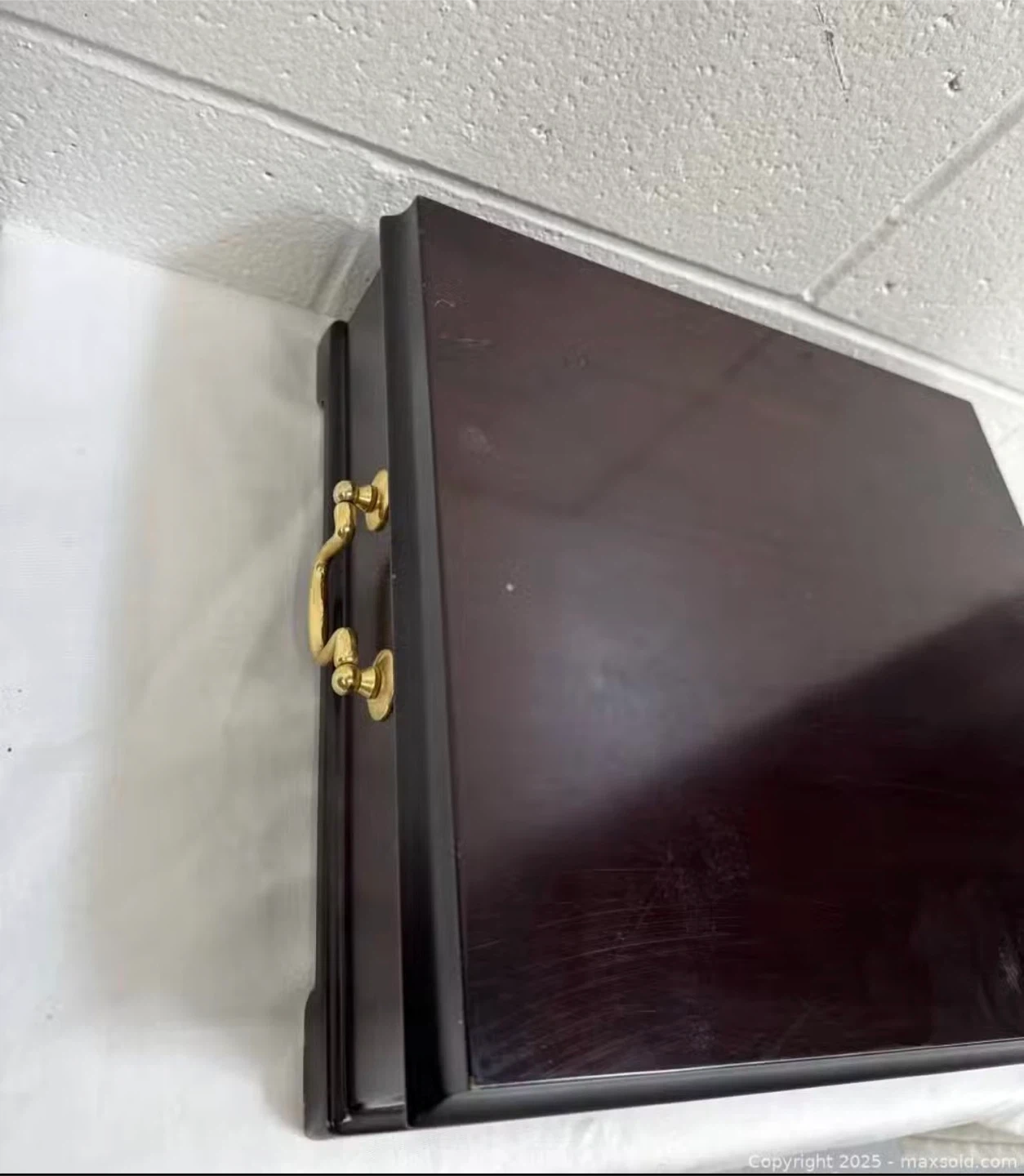This dark wood organizer box features 16 compartments for storage. It has a classic design with a brass-toned handle and hinges. The interior is lined with green felt.