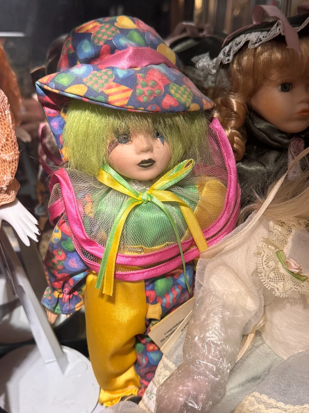 This is a collectible porcelain clown doll. It wears a vibrant, multi-colored outfit with a matching hat, complete with green hair and a ruffled collar. The doll has detailed facial features and is dressed in yellow pants and a patterned top. It's a charming piece for collectors!
