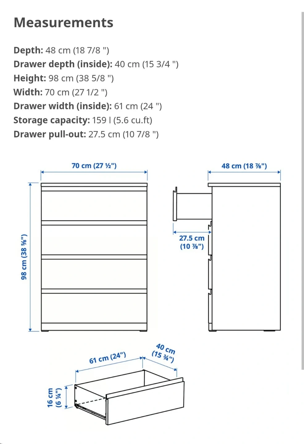 Great condition white dresser with 4 drawers. Measures 70 cm wide, 48 cm deep, and 98 cm tall. Drawer depth is 40 cm and width is 61 cm. Has a smooth and clean finish. Fourth drawer is defective