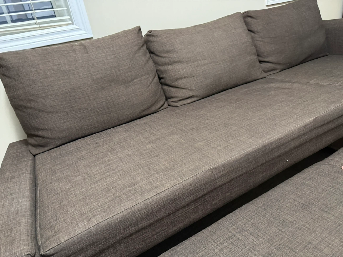 This is a brown sectional sofa with a pull-out bed and storage underneath. Upholstered in a durable, woven fabric. It's perfect for maximizing space in smaller homes or apartments!