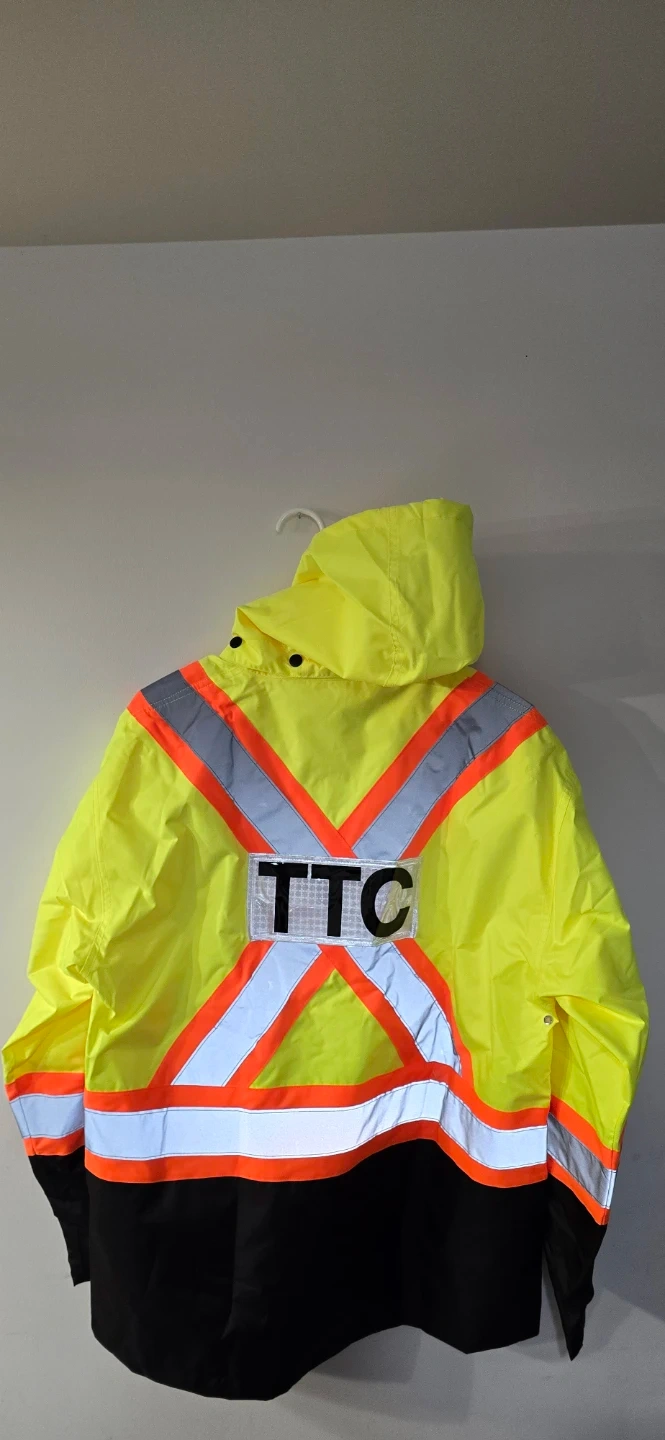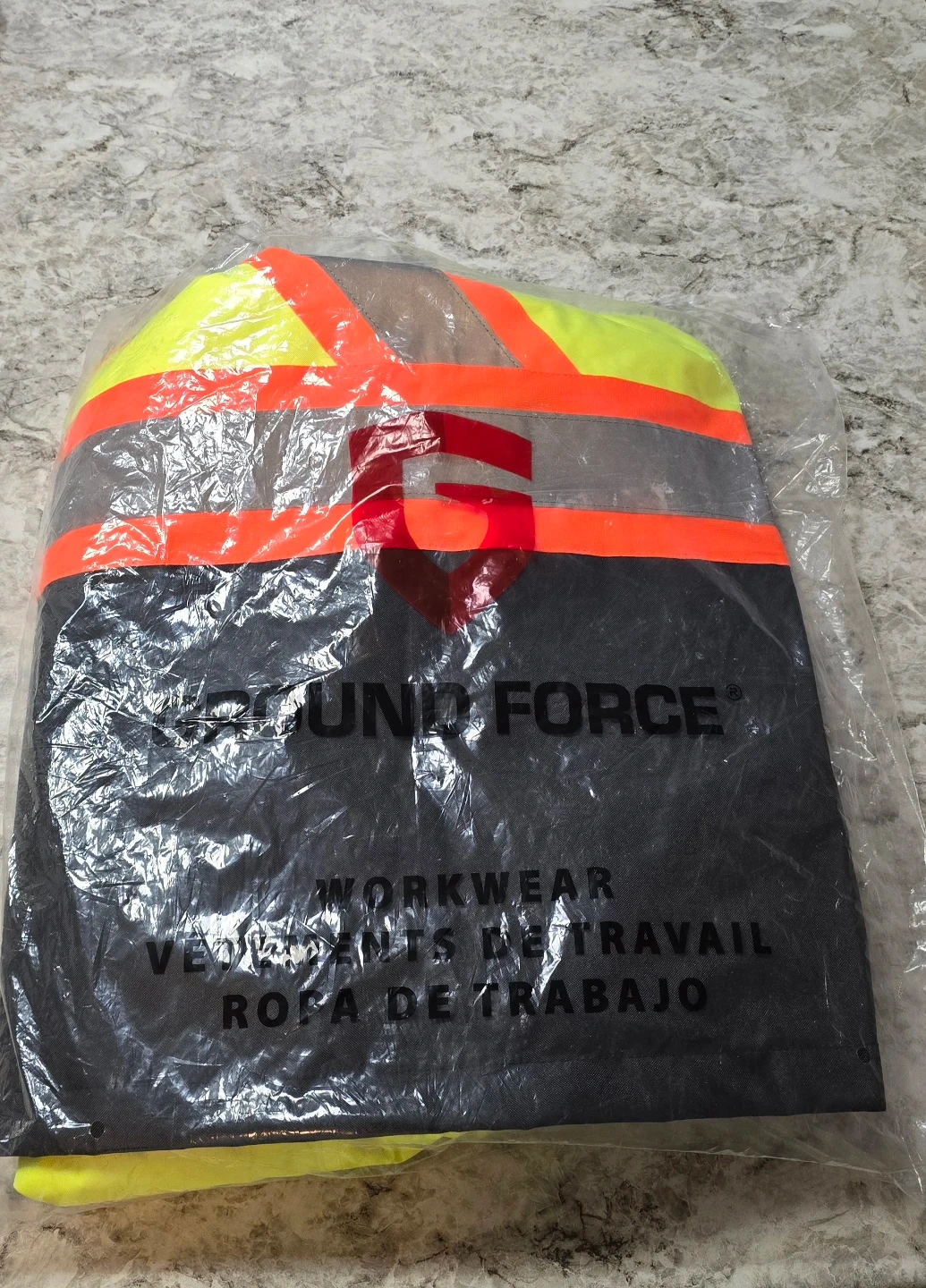 I have a brand new Ground Force workwear jacket. It's bright yellow with reflective stripes and the TTC logo on the back. Perfect for staying visible and safe on the job!