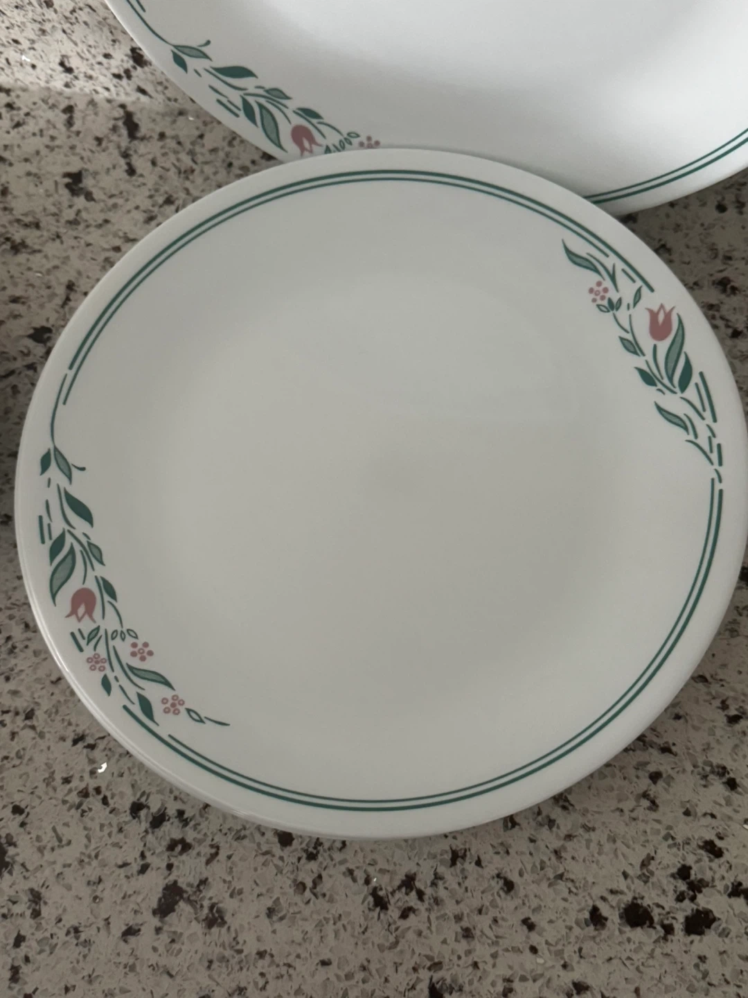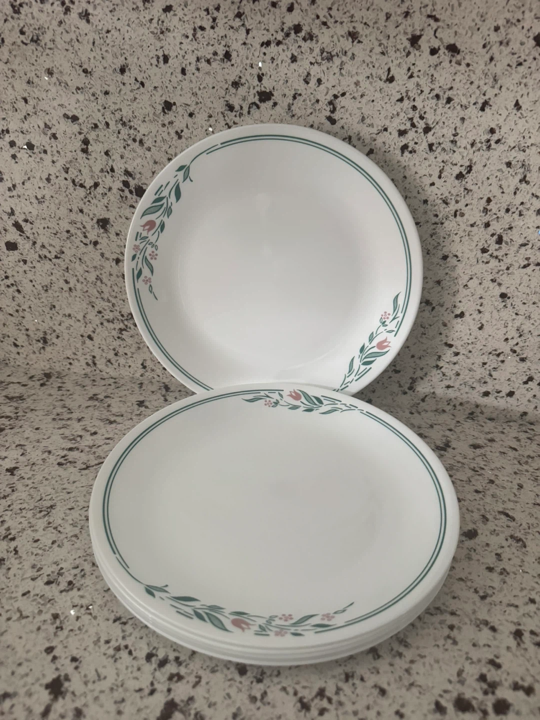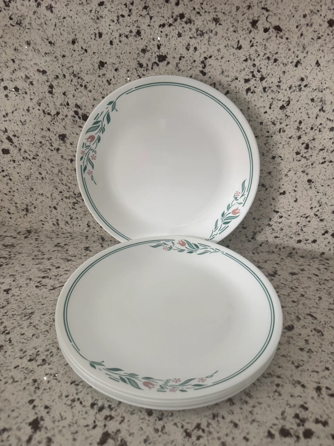 Selling a set of six Corelle dinner plates. They're in great shape and ready for a new home! The plates feature a delicate floral design around the rim. It has a circumference of 10.5 inches.