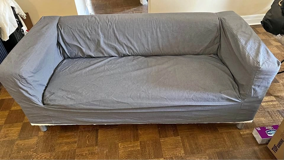 Grey fabric loveseat in good condition. Compact size, perfect for small spaces, apartments, or student rooms. Dimensions: Approx. 69" (L) x 32" (D) x 24" (H). Clean, no tears or major stains. Used - Good. From a pet-free home. The fabric cover is completely removable and machine washable! Pick up only.