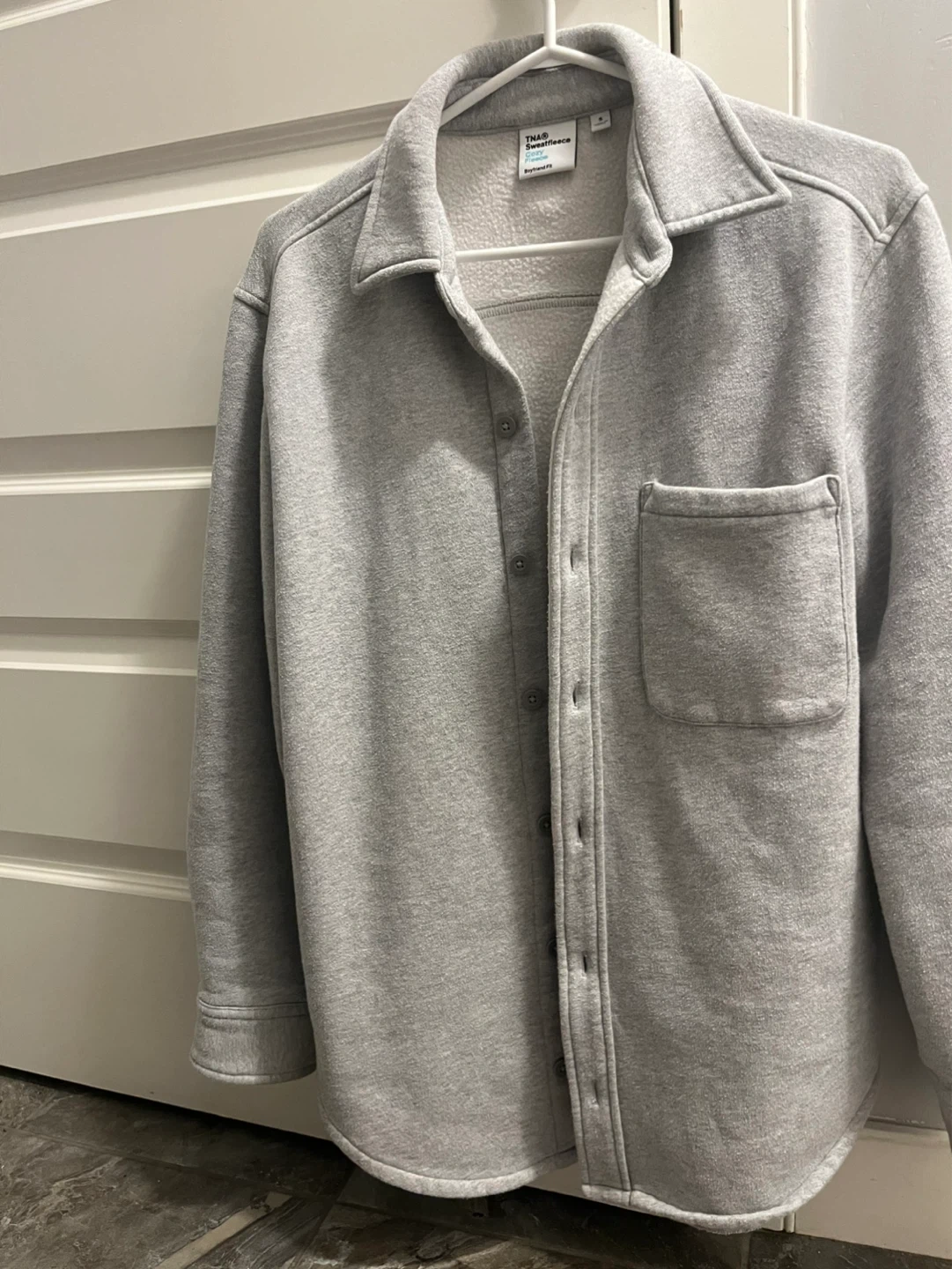 TNA Cozy Fleece Boyfriend Fit shirt in grey. It's a size small, made in China. This cozy fleece shirt is great for layering or wearing on its own!