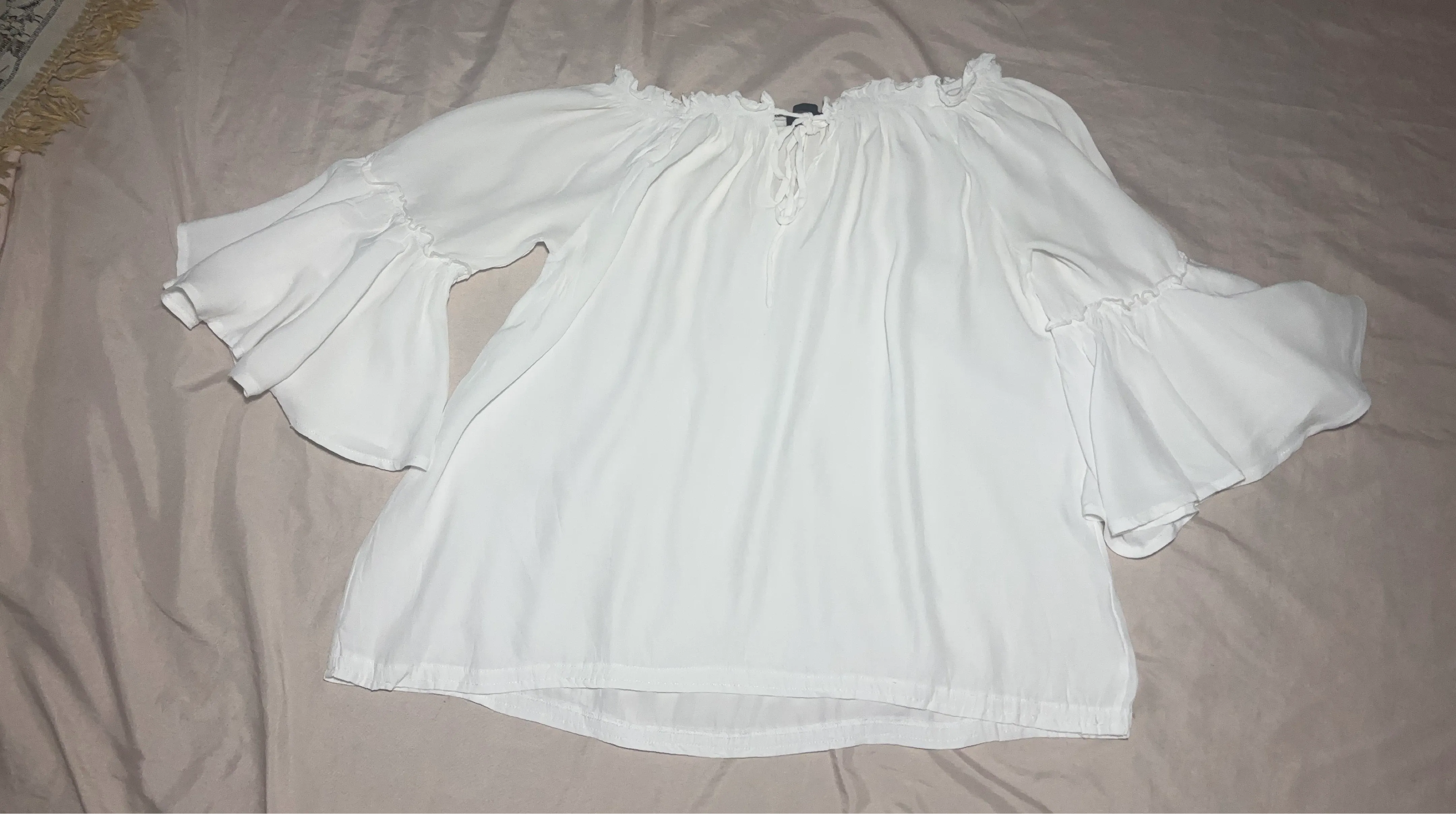 This is a white, off-the-shoulder blouse with ruffled neckline and dramatic bell sleeves. It features a tie-front detail at the neckline. Made from a lightweight fabric, it's perfect for warmer weather.