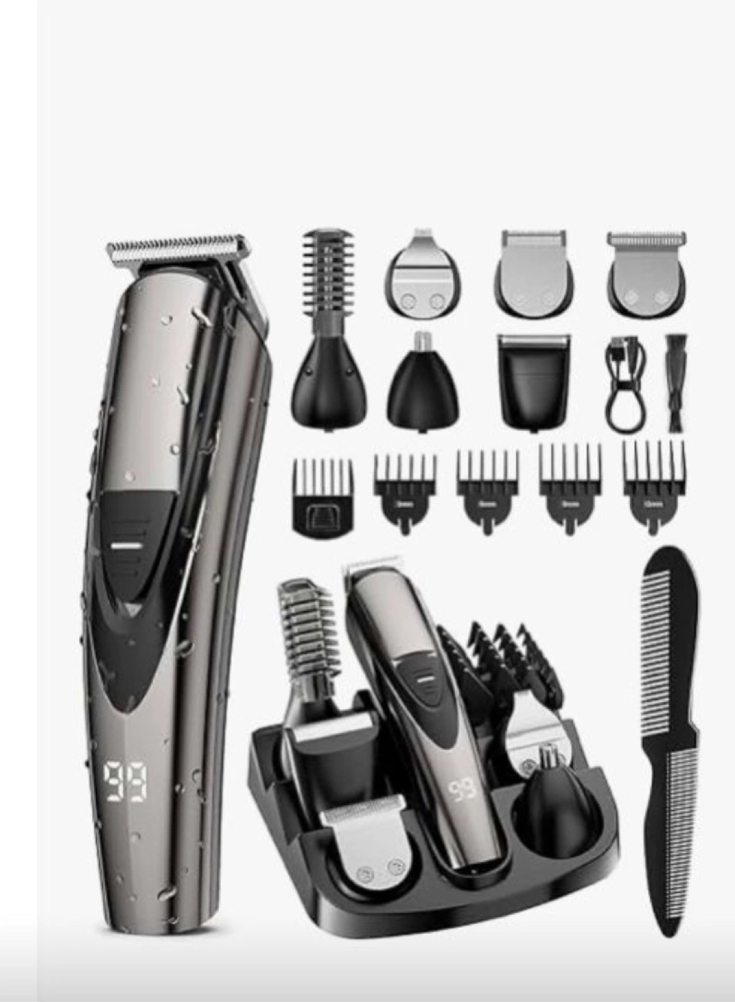 Complete grooming kit. Includes multiple attachments. Digital display. Charging base. Convenient for travel.