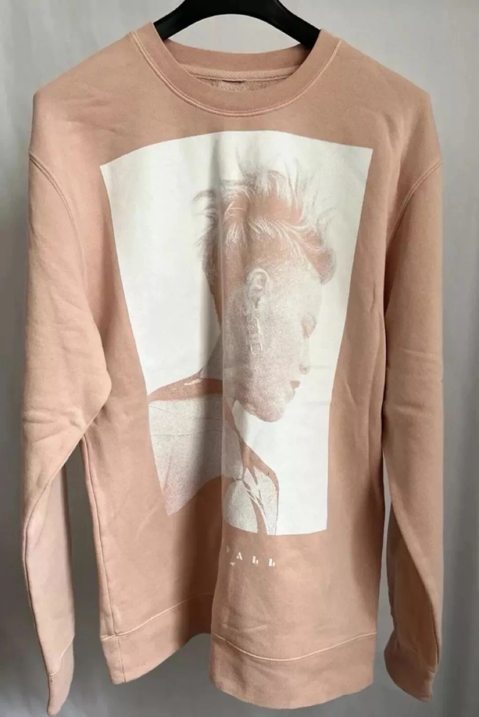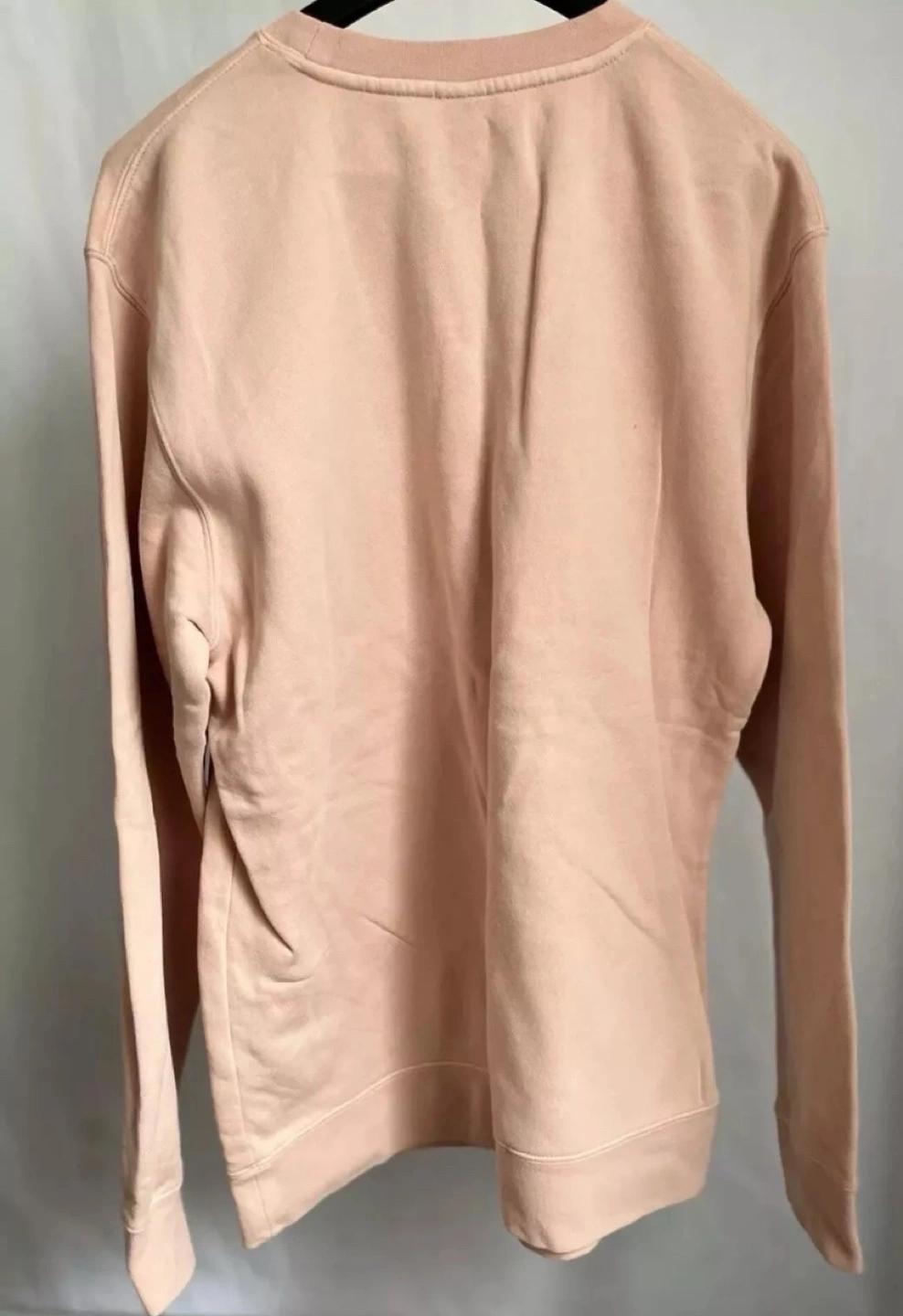 Pink sweatshirt, light pink colour, long sleeves, crew neck.