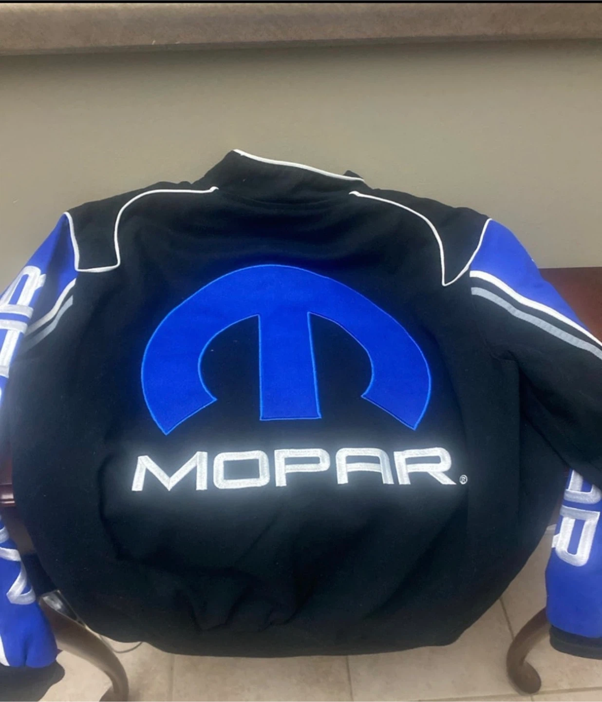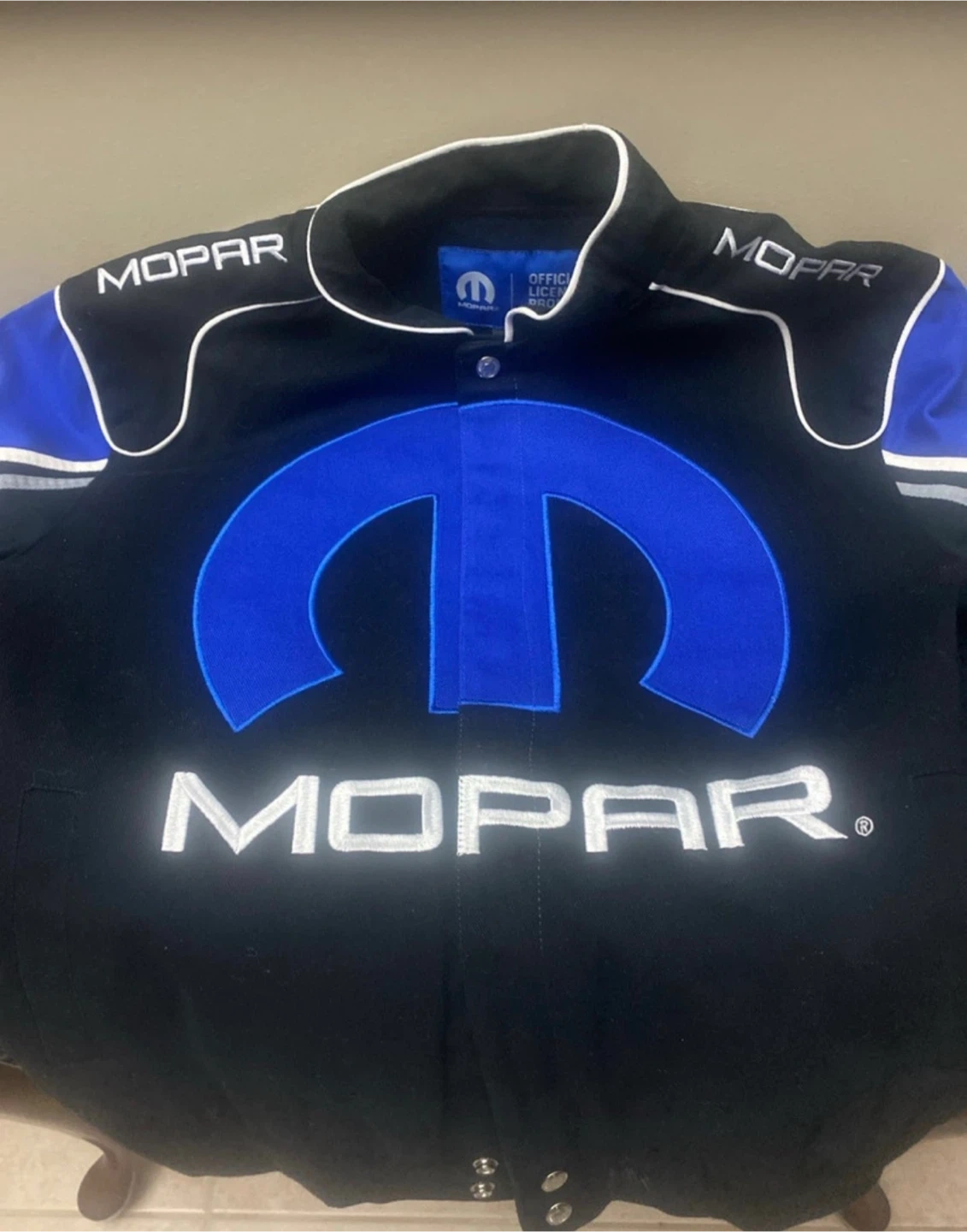 Mopar racing jacket with large Mopar logo on front and back. Blue and white accents on sleeves and shoulders. Snap button closure. Officially licensed product.